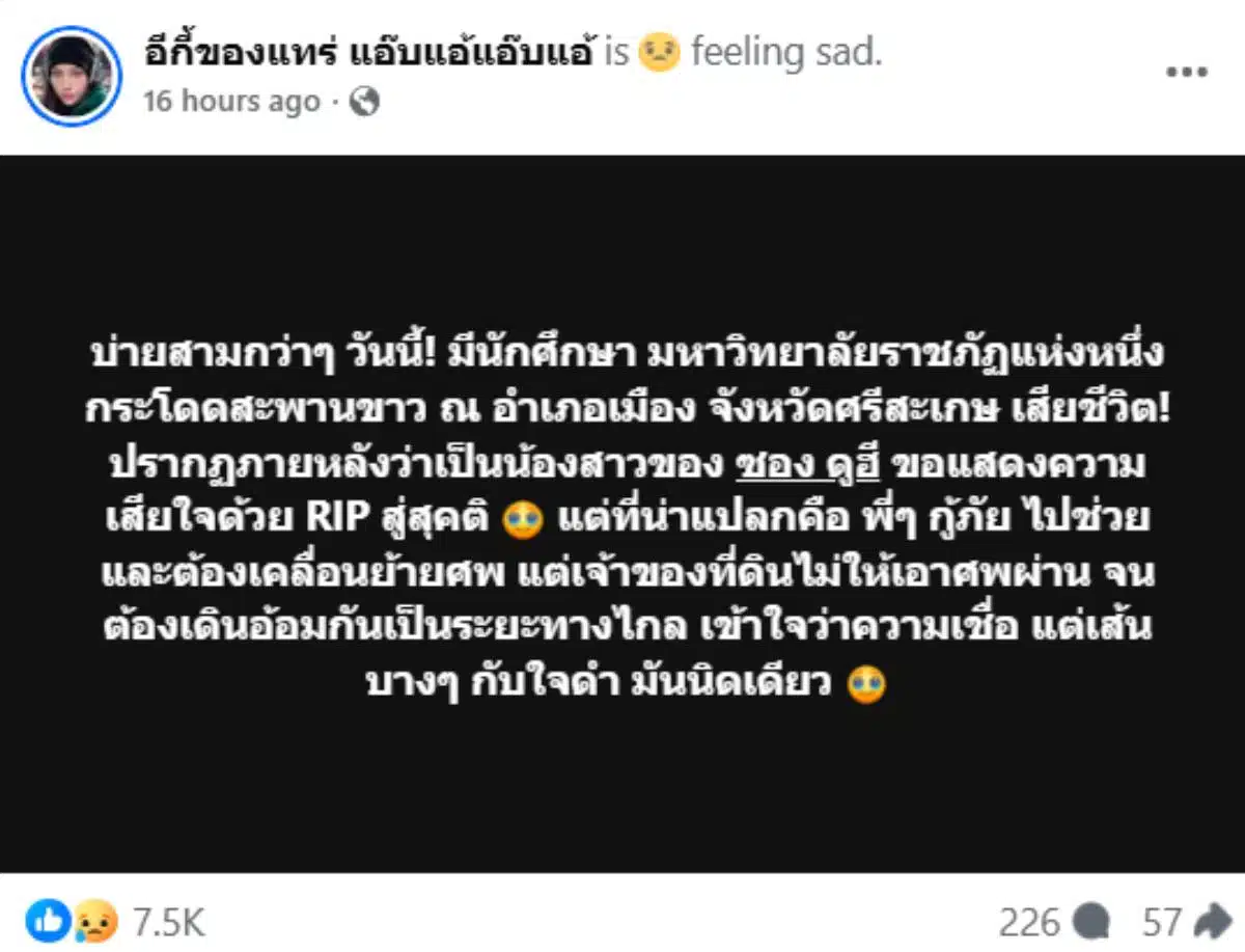 จากเหตุการณ์ดราม่าที่เพจอีกี้ของแทร่ แอ๊บแอ้แอ๊บแอ้ นำคลิปเหตุการณ์มาเผยแพร่พร้อมระบุข้อความว่า นาทีพี่ๆ กู้ภัย นำร่างน้องสาวซองดูฮีที่เสียชีวิต! แต่เจ้าของที่ดินไม่ให้นำศพผ่าน ต้องเดินอ้อมกัน ปล. ขอแสดงความเสียใจกับครอบครัว อีกครั้ง! Rest in peace ขอดวงวิญญาณจงไปสู่ภพภูมิที่ดี
