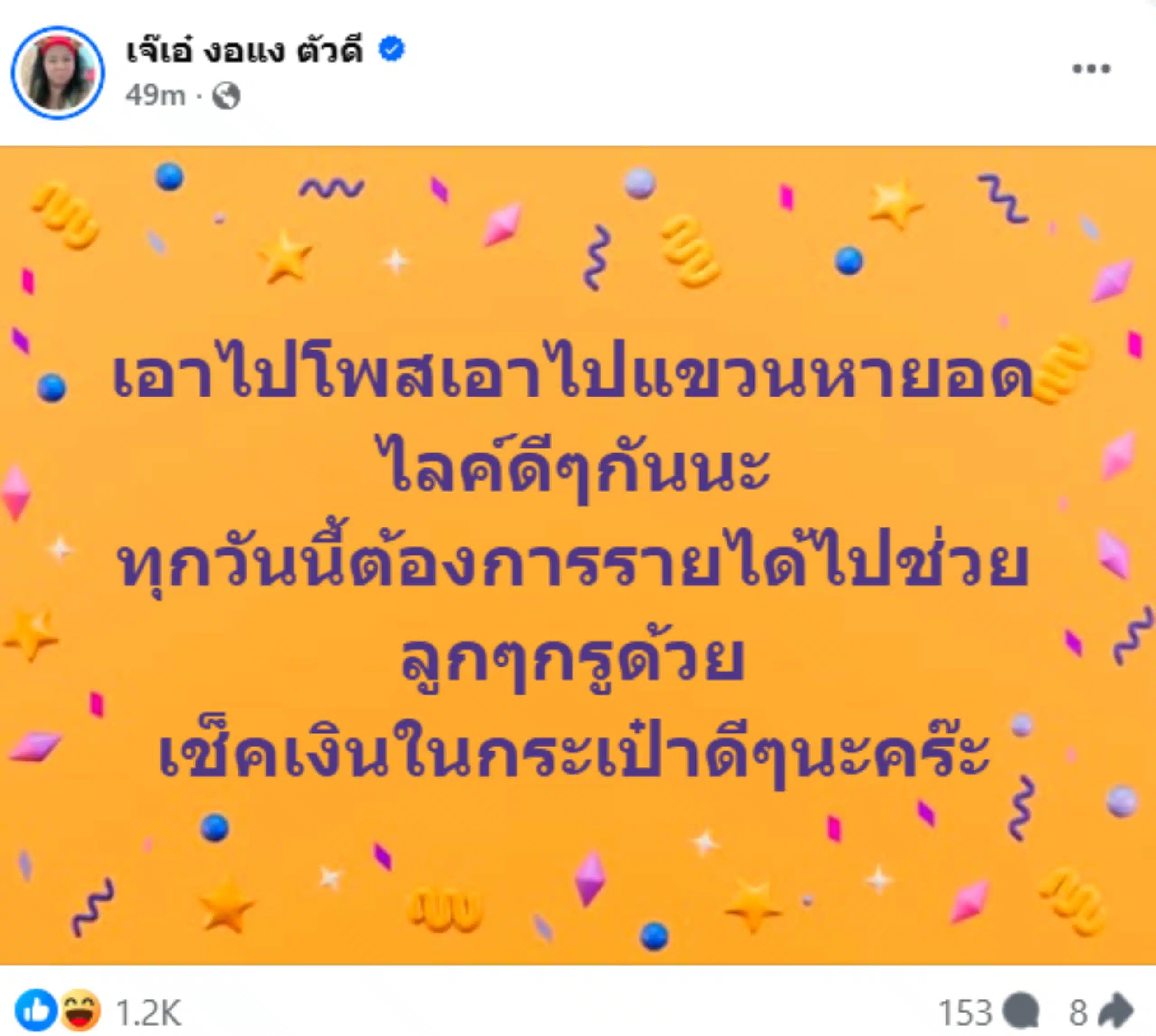 ถึงตรงนี้ พอกระแสเริ่มถูกแชร์ถูกส่งต่อและใส่คอมเมนต์เผ็ดร้อนกันไม่ยั้งนิ้วมือ ล่าสุด เจ๊เอ๋ โพสต์เตือนไปยังกลุ่มที่นำตนไปแขวนบนออนไลน์ชัดเจนจะไม่ปล่อยไว้ “เอาไปโพสเอาไปแขวนหายอดไลค์ดีๆ กันนะ ทุกวันนี้ต้องการรายได้ไปช่วยลูกๆกรูด้วย