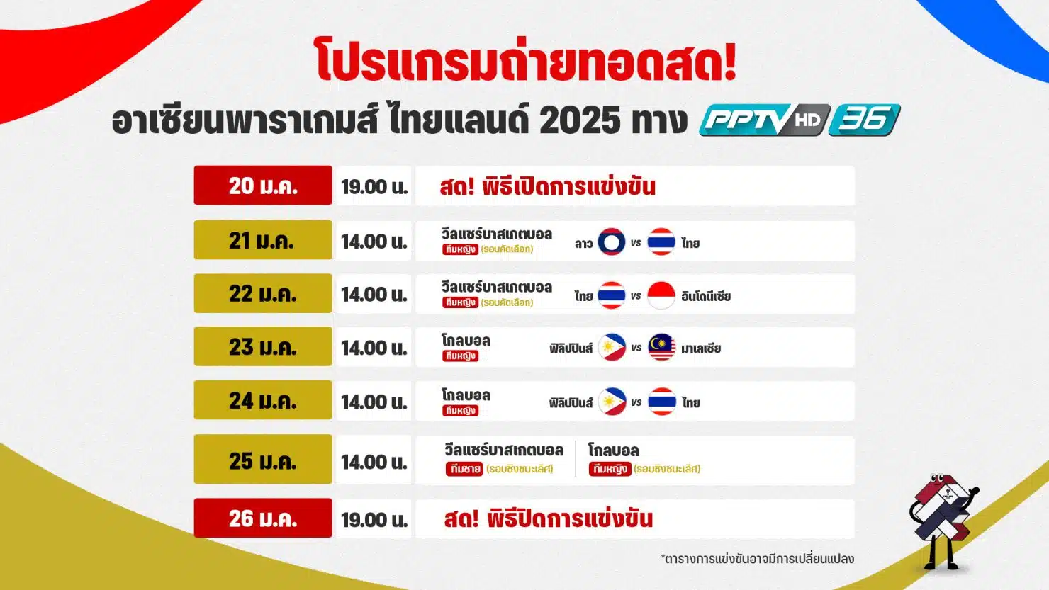 ถ่ายทอดสด อาเซียนพาราเกมส์ 2026 ทุกวัน 20–26 ม.ค. 69 พิธีเปิด ช่อง PPTVHD 36