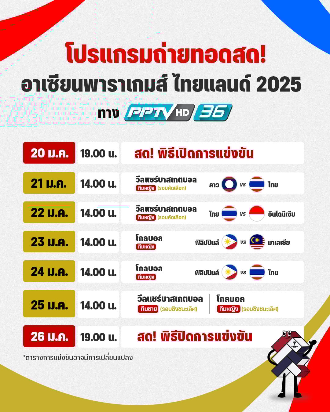 แฟน ๆ ชาวไทยทั้งประเทศห้ามพลาด! ร่วมส่งเสียงเชียร์และส่งแรงใจให้ทัพนักกีฬาไทยหัวใจนักสู้ ในฐานะเจ้าภาพศึก “อาเซียนพาราเกมส์ ครั้งที่ 13” ระหว่างวันที่ 20–26 มกราคมนี้ พีพีทีวี ถ่ายทอดสดให้ชมทุกวัน ตั้งแต่เวลา 14.00 น. เป็นต้นไป พร้อมติดตามผลการแข่งขันและอัปเดตทุกความเคลื่อนไหวตลอดทัวร์นาเมนต์ รวมถึงการถ่ายทอดสดพิธีเปิดการแข่งขัน ในวันอังคารที่ 20 มกราคมนี้ เวลา 19.00 น. เป็นต้นไป รับชมได้ทางหน้าจอ PPTV HD 36 และ PPTV Sports