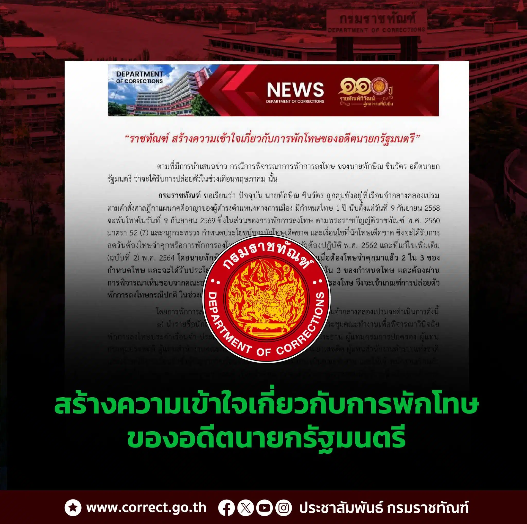 ราชทัณฑ์ สร้างความเข้าใจเกี่ยวกับการพักโทษของนายทักษิณ ชินวัตร อดีตนายกรัฐมนตรี