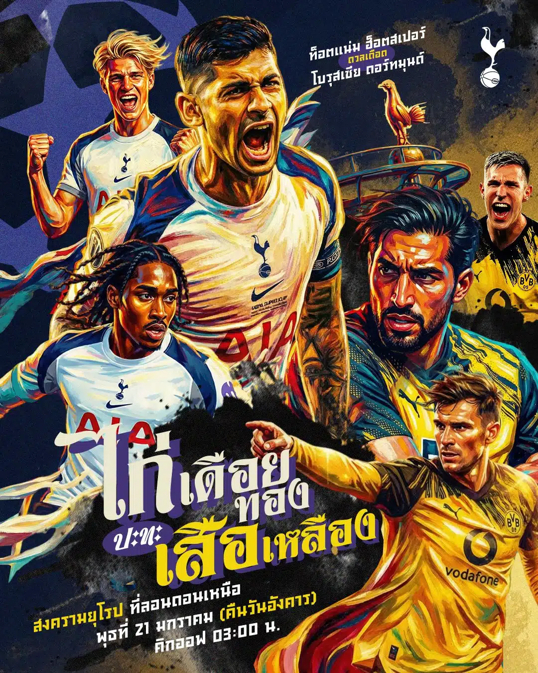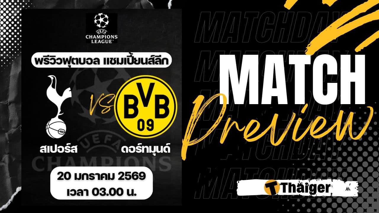 20 มกราคม 69 ดูบอลสด ฟุตบอล ยูฟ่า แชมเปี้ยนส์ ลีก รอบลีกเฟส นัดที่ 7 ระหว่าง สเปอร์ส พบ ดอร์ทมุนด์ ที่สนาม ท็อตแน่ม ฮอตสเปอร์ สเตเดี้ยม เวลา 03:00 น. ตามเวลาประเทศไทย พร้อมถ่ายทอดสด