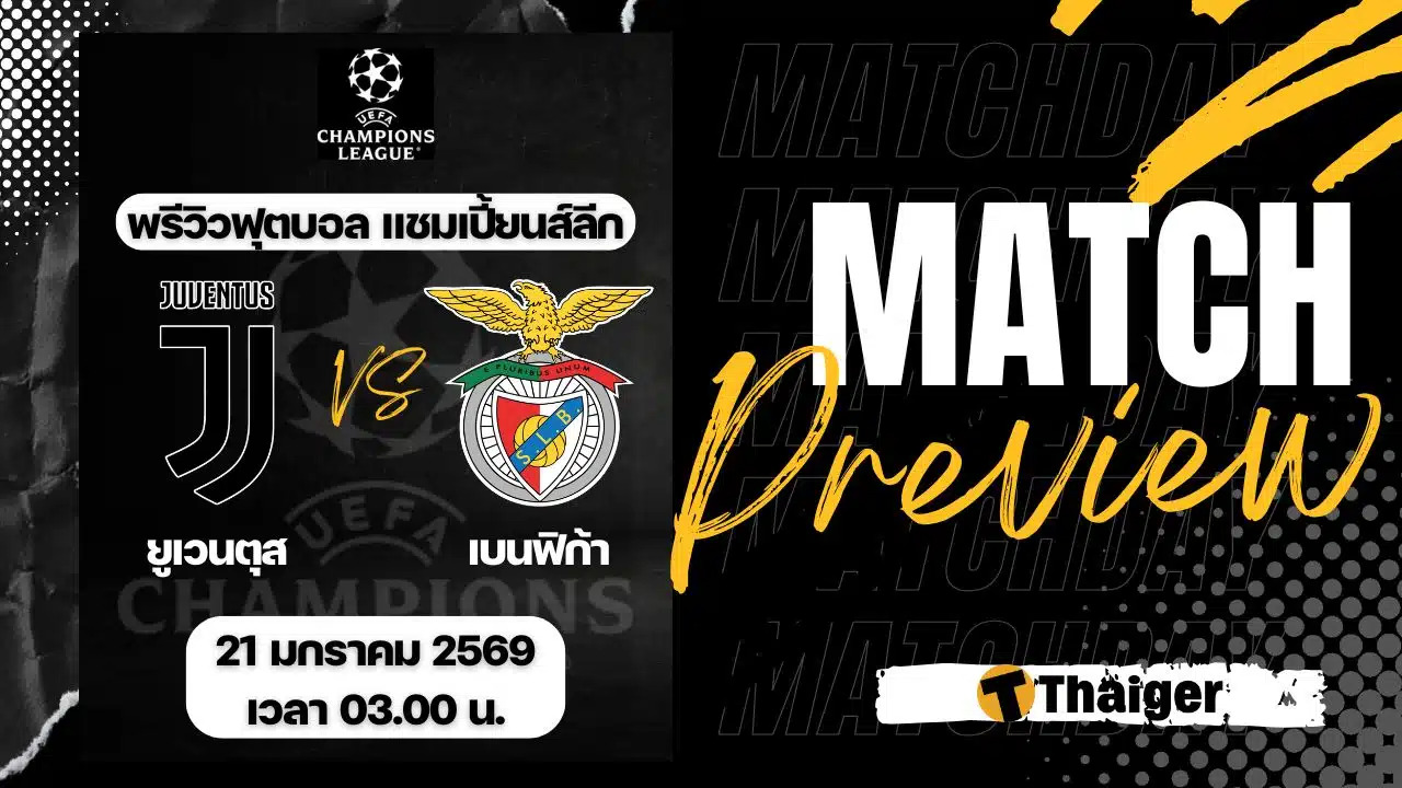 21 มกราคม 69 ดูบอลสด ฟุตบอล ยูฟ่า แชมเปี้ยนส์ ลีก รอบลีกเฟส นัดที่ 7 ระหว่าง ยูเวนตุส พบ เบนฟิก้า ที่สนาม อัลลิอันซื สเตเดี้ยม เวลา 03:00 น. ตามเวลาประเทศไทย พร้อมถ่ายทอดสด
