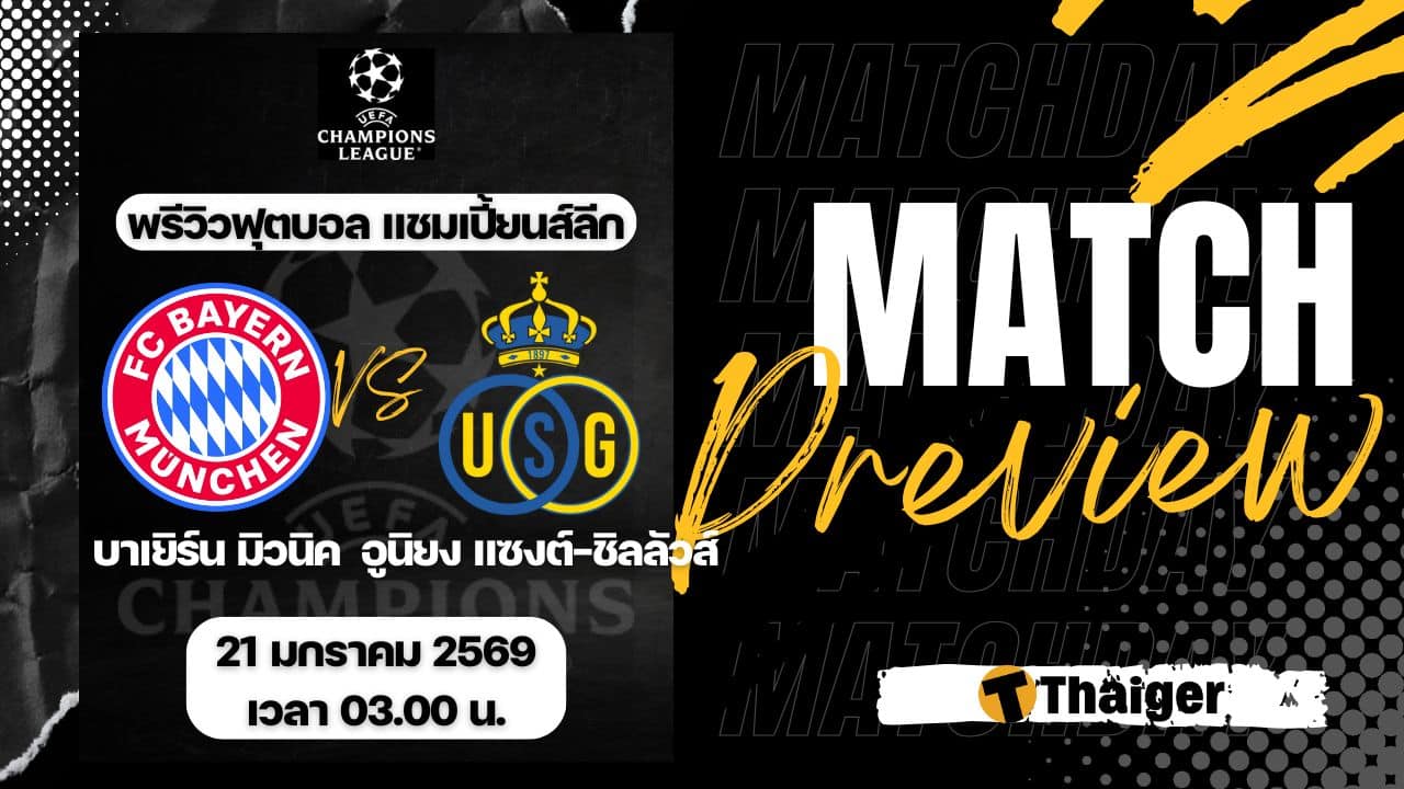 21 มกราคม 69 ดูบอลสด ฟุตบอล ยูฟ่า แชมเปี้ยนส์ ลีก รอบลีกเฟส นัดที่ 7 ระหว่าง บาเยิร์น มิวนิค พบ อูนิยง แซงต์-ชิลลัวส์ ที่สนาม อัลลิอันซ์ อารีน่า เวลา 03:00 น. ตามเวลาประเทศไทย พร้อมถ่ายทอดสด