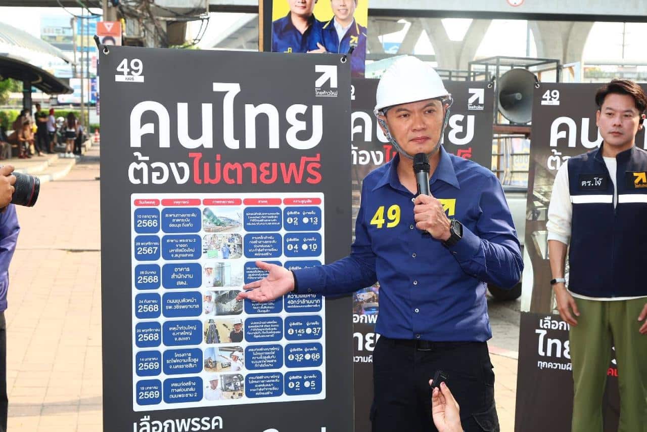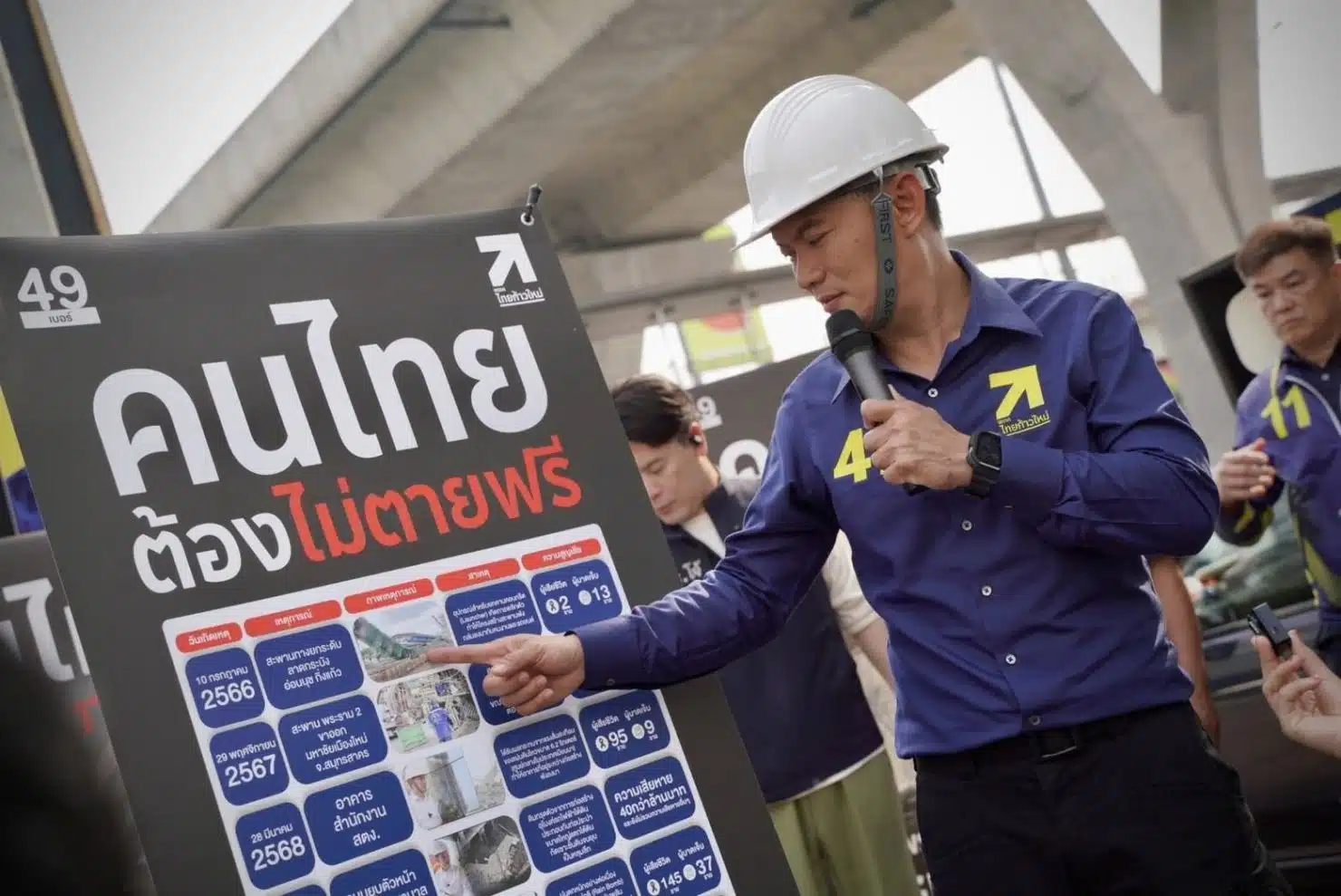 นายสุชัชวีร์ สุวรรณสวัสดิ์ หรือ ดร.เอ้ หัวหน้าพรรคไทยก้าวใหม่ แคนดิเดตนายกรัฐมนตรี แถลงข่าว “คนไทยต้องไม่ตายฟรี” จากทั้งเหตุเครนถล่ม ตึกถล่ม ถนนยุบ หลังจากที่ผ่านเหตุการณ์เครนถล่ม 2 จุดครบ 1 สัปดาห์