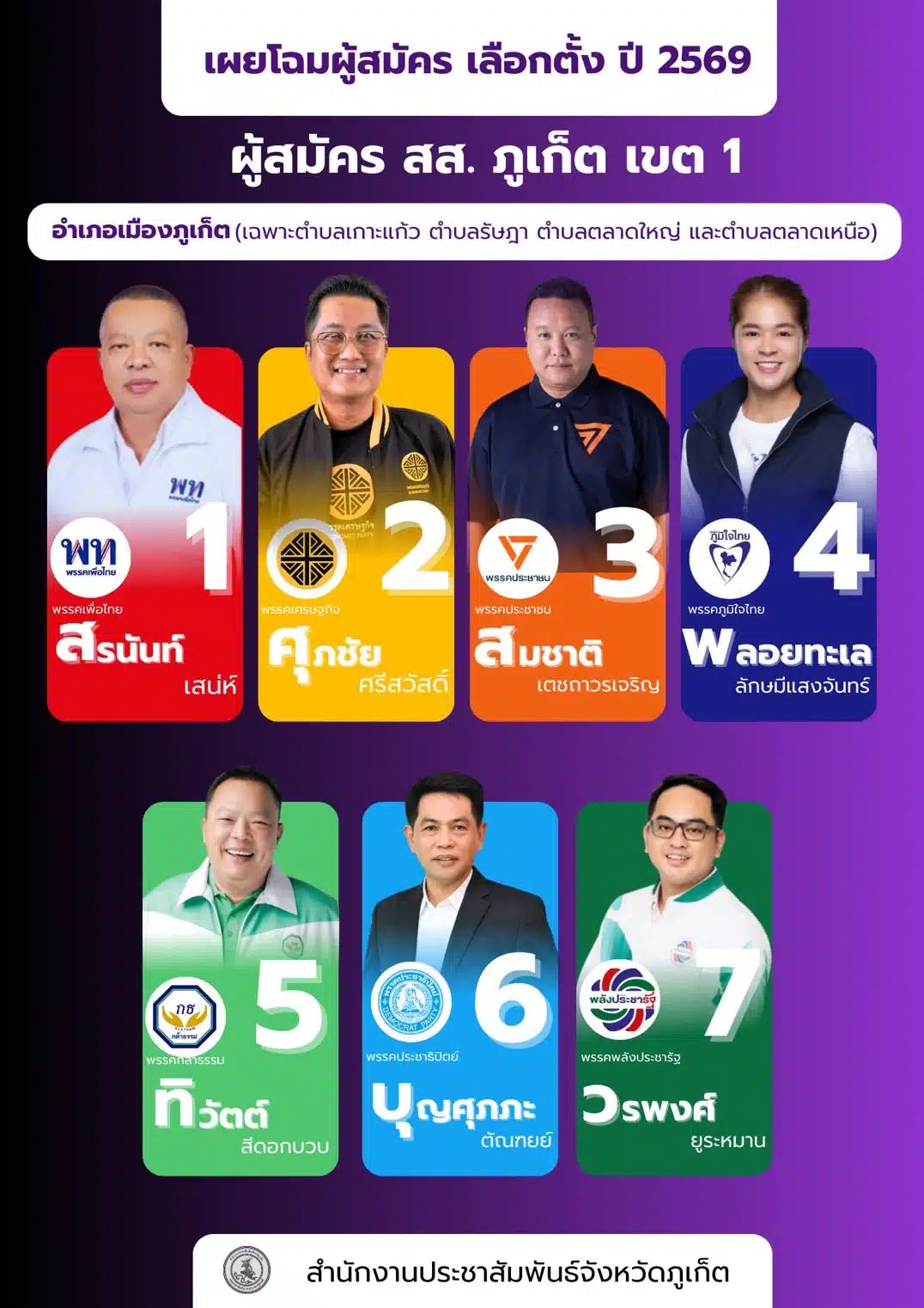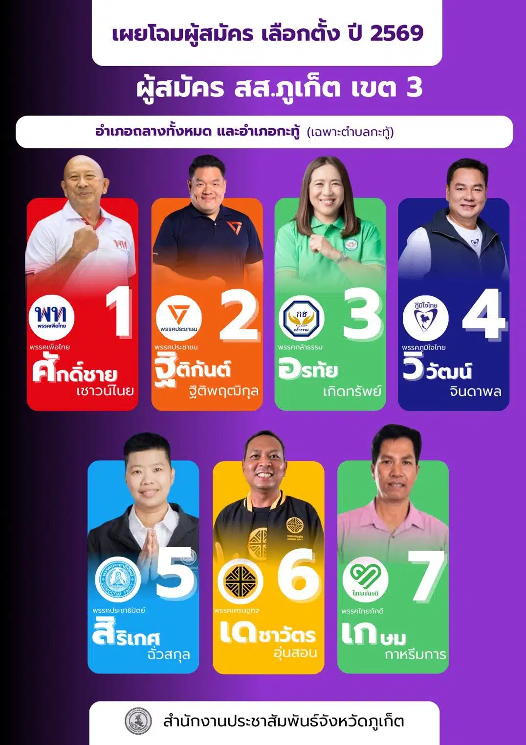 รายชื่อผู้สมัคร ส.ส. ภูเก็ต เช็กเบอร์-พรรค 3 เขต : เลือกตั้ง 2569