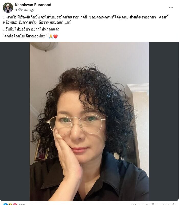แต่ทว่า ในอีกฟากหนึ่ง ปู กนกวรรณ กลับมีความเคลื่อนไหว ระบายความในใจ ขอบคุณกัลยาณมิตรที่ช่วยดึงสติให้กลับมา พร้อมระบุถ้อยคำที่ชวนสงสัยว่า พร้อมยอมรับความจริง ถือว่าหมดบุญกันแค่นี้ นอกจากนี้ยังเผยความตั้งใจเร่งด่วนว่า กำลังดำเนินการขอวีซ่าเพื่อเดินทางไปหาลูกสาว ทิ้งท้ายประโยคสุดซึ้งว่า ลูกคือโลกใบเดียวของปู