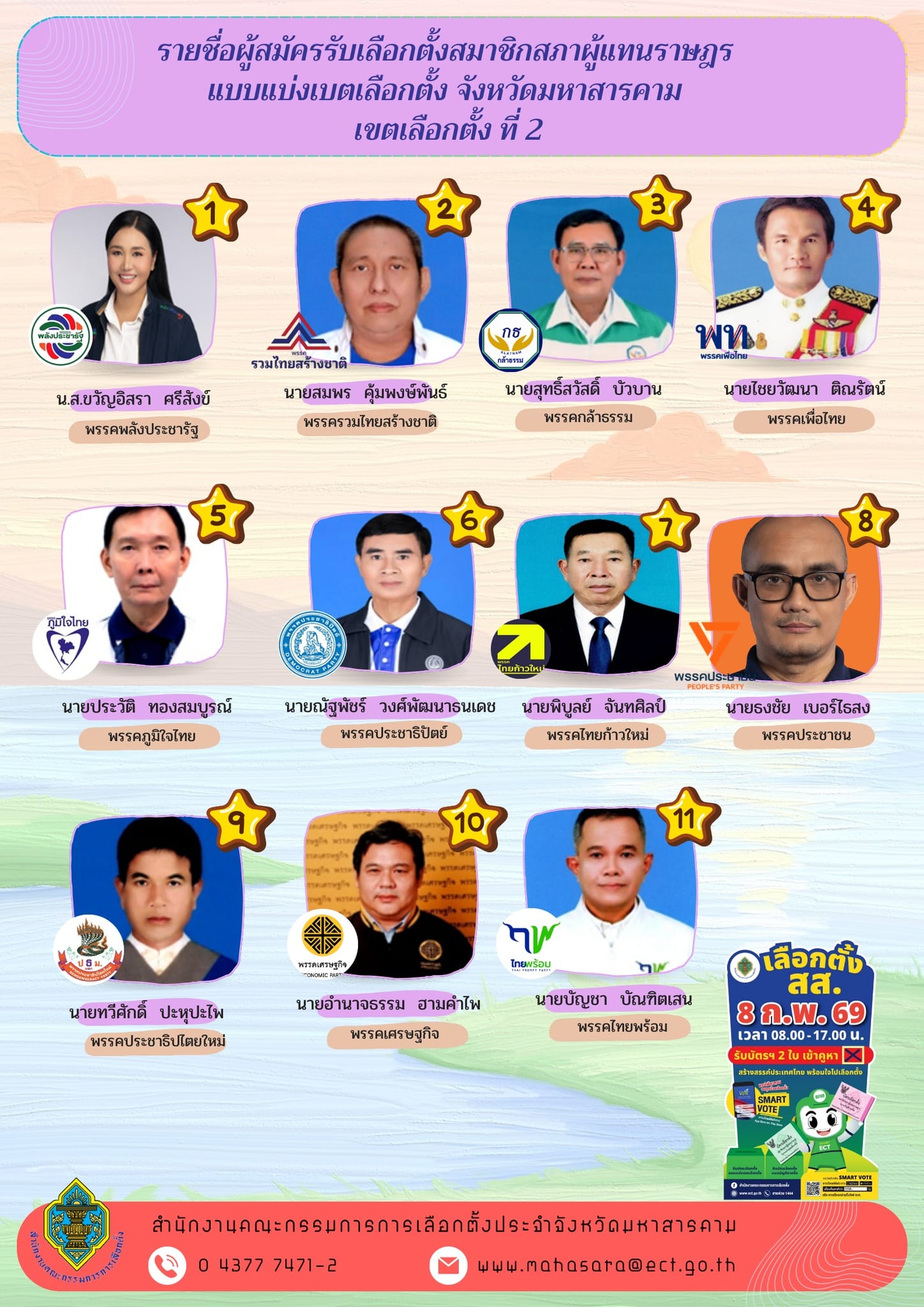 สำนักงานคณะกรรมการการเลือกตั้ง (กกต.) ได้ประกาศรายชื่อผู้สมัครรับเลือกตั้งสมาชิกสภาผู้แทนราษฎร (สส.) แบบแบ่งเขตเลือกตั้ง จ.มหาสารคาม อย่างเป็นทางการ ภายหลังปิดรับสมัครไปเมื่อวันที่ 27 – 31 ธันวาคม 2568 ที่ผ่านมา เพื่อให้ประชาชนได้ตรวจสอบรายชื่อและหมายเลขผู้สมัคร ก่อนจะถึงวันใช้สิทธิออกเสียงเลือกตั้งที่จะถึงนี้