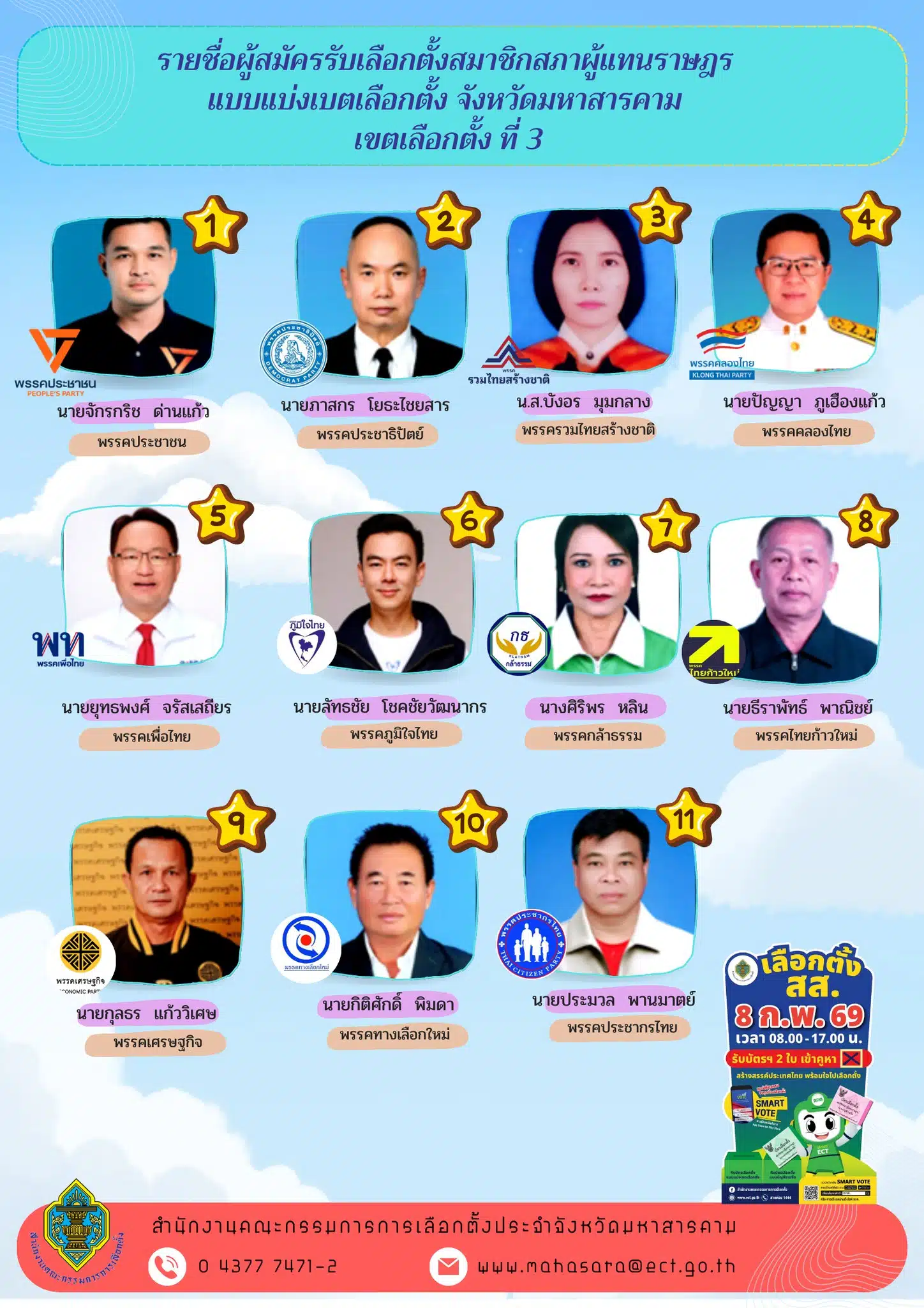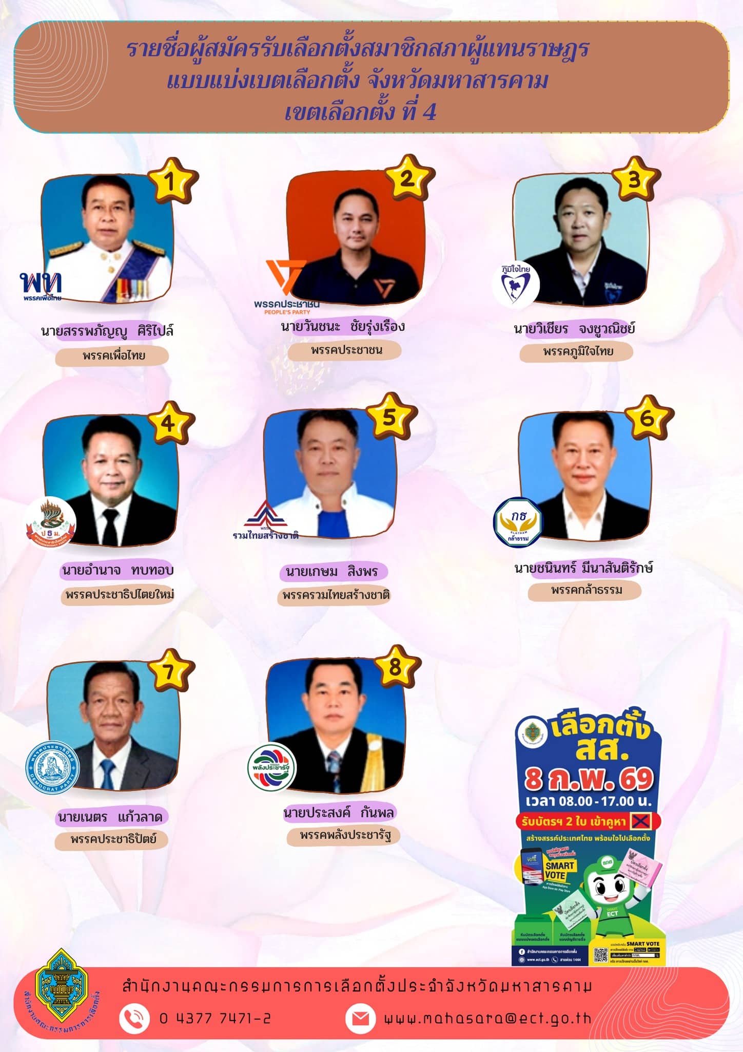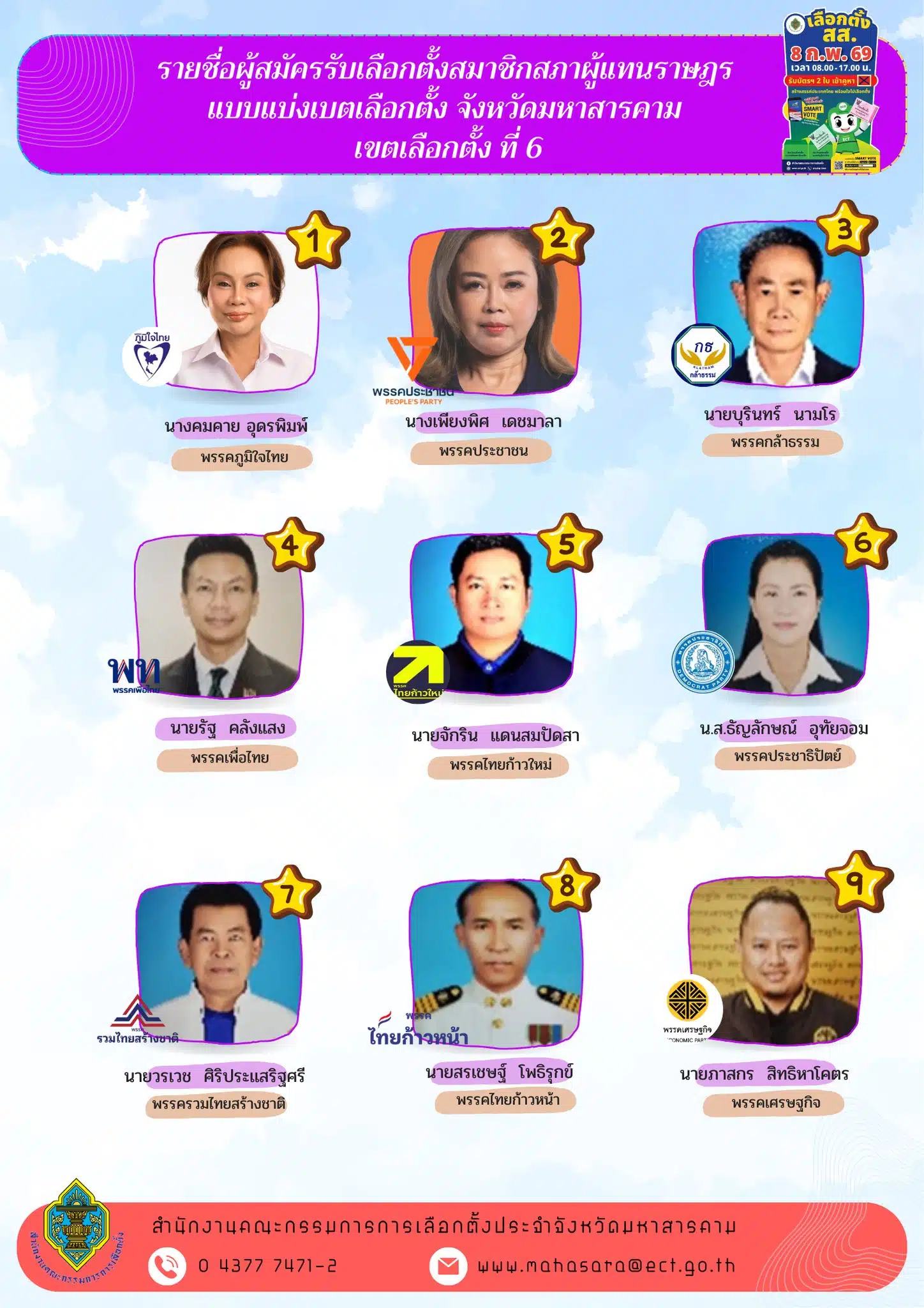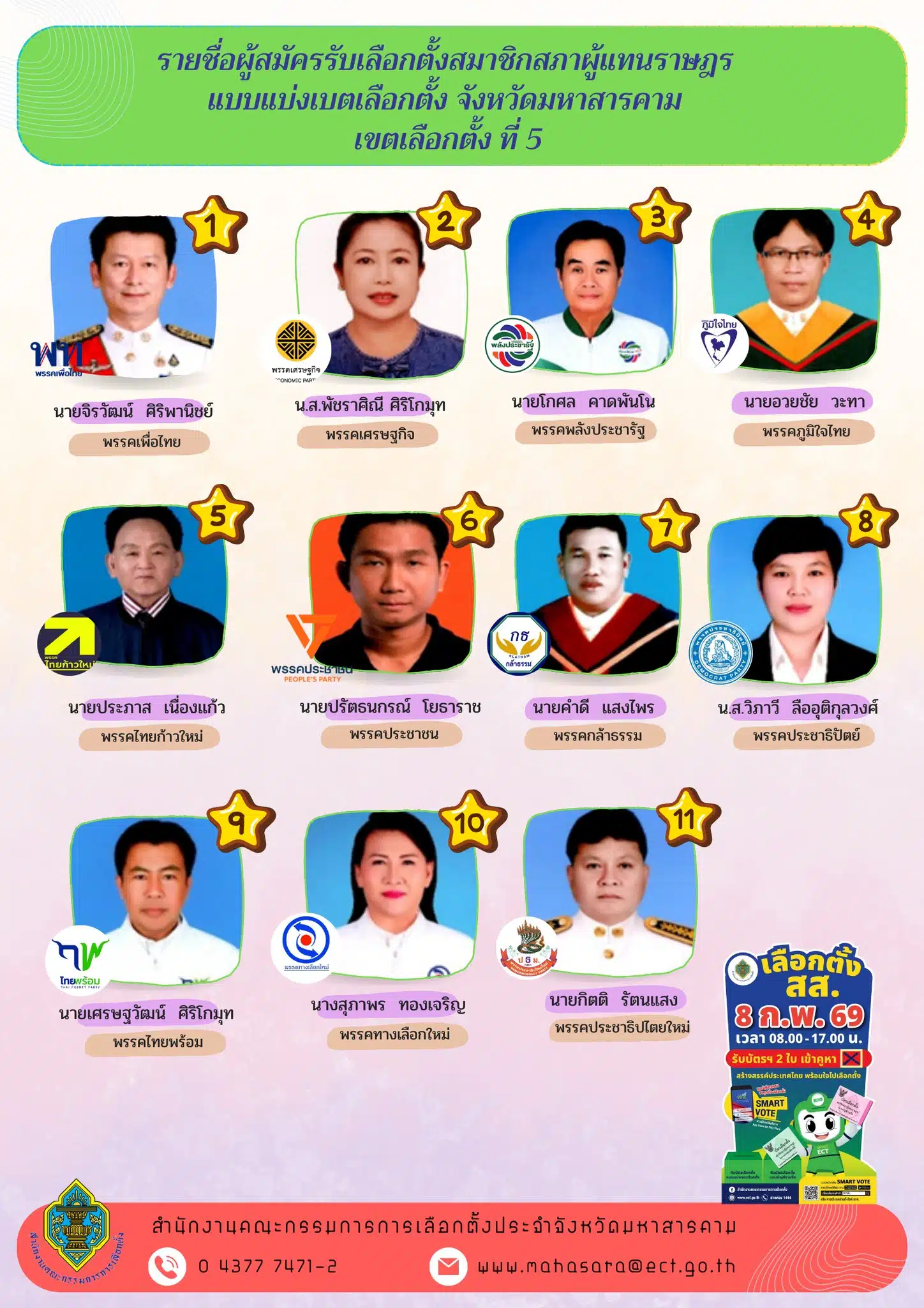 รายชื่อผู้สมัคร สส. มหาสารคาม แบบแบ่งเขต ทั้ง 6 เขต เช็กเบอร์-พรรค เลือกตั้ง 2569