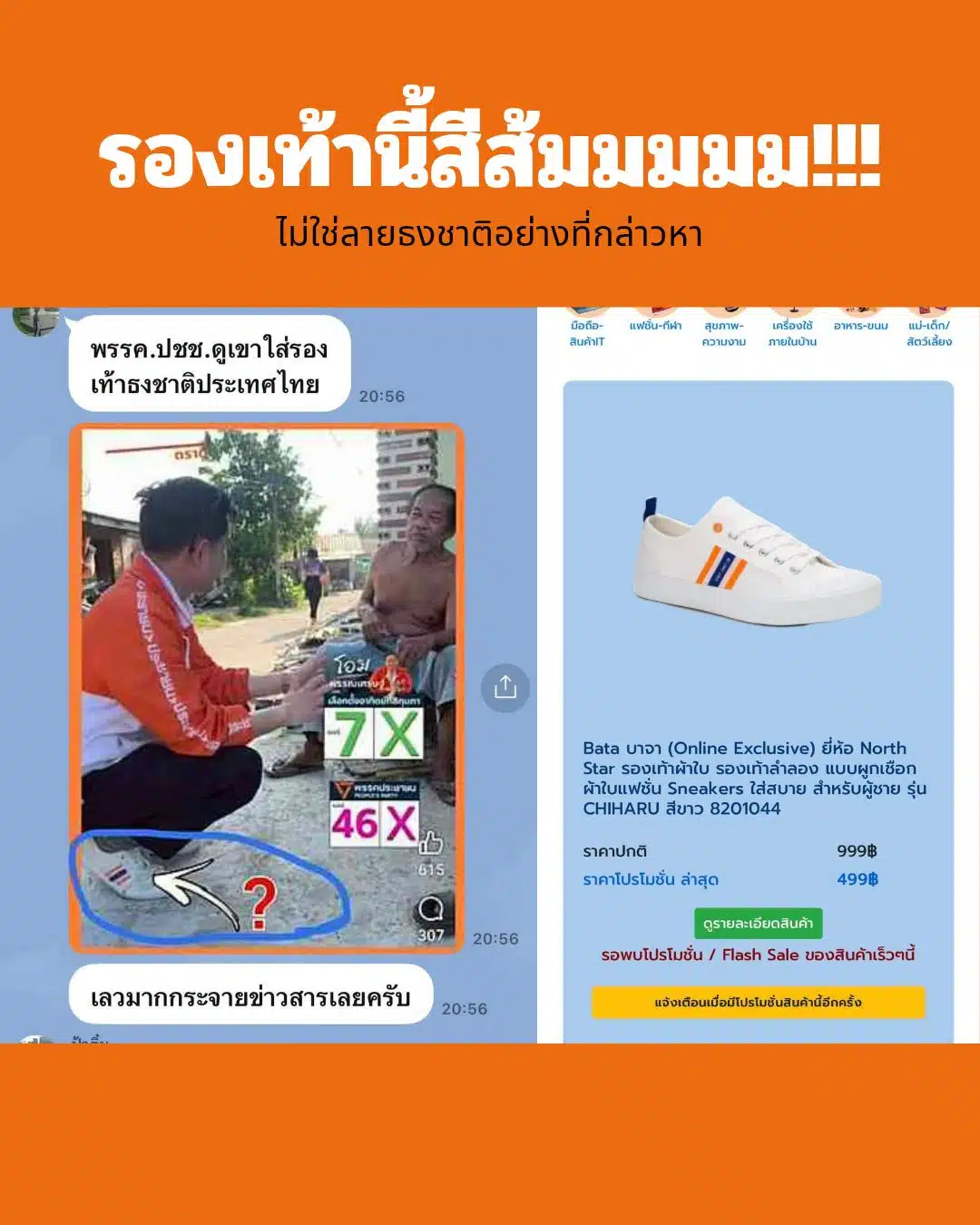 จากคลิปที่ผมได้ลงพื้นที่ไปพูดคุยกับพี่น้องประชาชนและหลายท่านเกิดความไม่สบายใจเรื่องร้องเท้าที่ผมใส่อยู่ ผมซื้อรองเท้าคู่นี้มาน่าจะ 2 ปีกว่าๆ แล้วครับ และใส่อยู่บ่อยครั้งมากๆ เป็นร้องเท้ายี่ห้อ Bata ที่อยู่คู่กับคนไทยมาช้านาน จนผมยังเข้าใจว่าเป็นแบรนด์ไทยด้วยซ้ำไป ชื่อรุ่น CHIHARU ซื้อมาในราคา 499 บาทถ้วน ที่ช็อปบาจาในห้างสรรพสินค้าแห่งหนึ่ง ตอนนั้นที่ซื้อก็ไม่เคยคิดว่ามันจะเหมือนลายธงชาติแต่ประการใด เพราะสีของลายเป็นสีส้มสดใสชัดเจน บวกกับสีน้ำเงินที่เป็นสีประจำพรรคก้าวไกลในตอนนั้นครับ