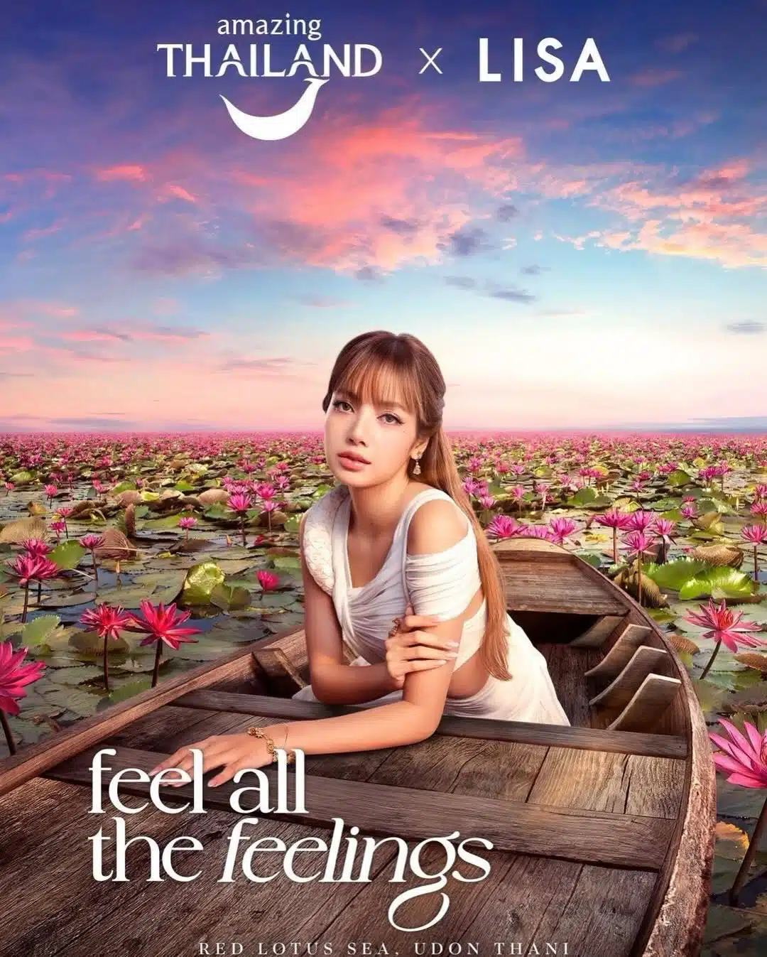 ล่าสุดภาพโปรโมตใหม่ ทำเอาแชร์ไปทั่วโลก ลิซ่านั่งอยู่บนเรือลำน้อย ท่ามกลางทุ่งดอกบัวสีแดงสดบานสะพรั่งสุดลูกหูลูกตา ตัดกับผืนน้ำและท้องฟ้าที่ดูเงียบสงบ ที่เที่ยวใหม่เตรียมฮิต ทะเลบัวแดง อำเภอกุมภวาปี จังหวัดอุดรธานี