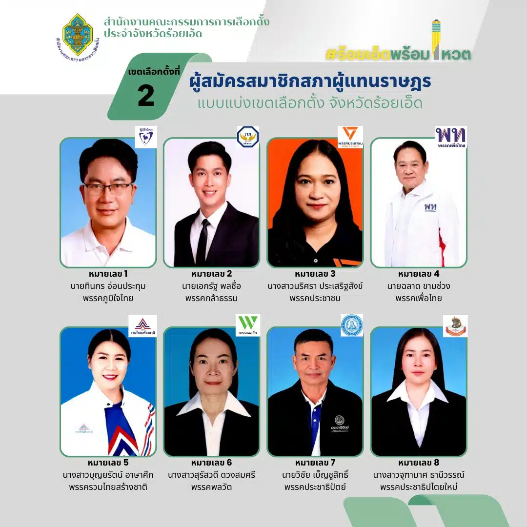 กกต. ประกาศรายชื่อ หมายเลขผู้สมัคร สส. ร้อยเอ็ด อย่างเป็นทางการ ทั้ง 8 เขตเลือกตั้ง เช็กรายชื่อและเบอร์ผู้สมัครได้ที่นี่