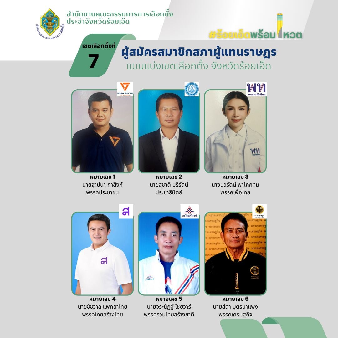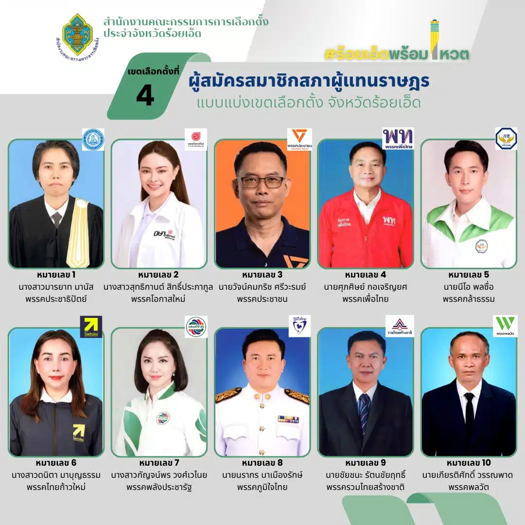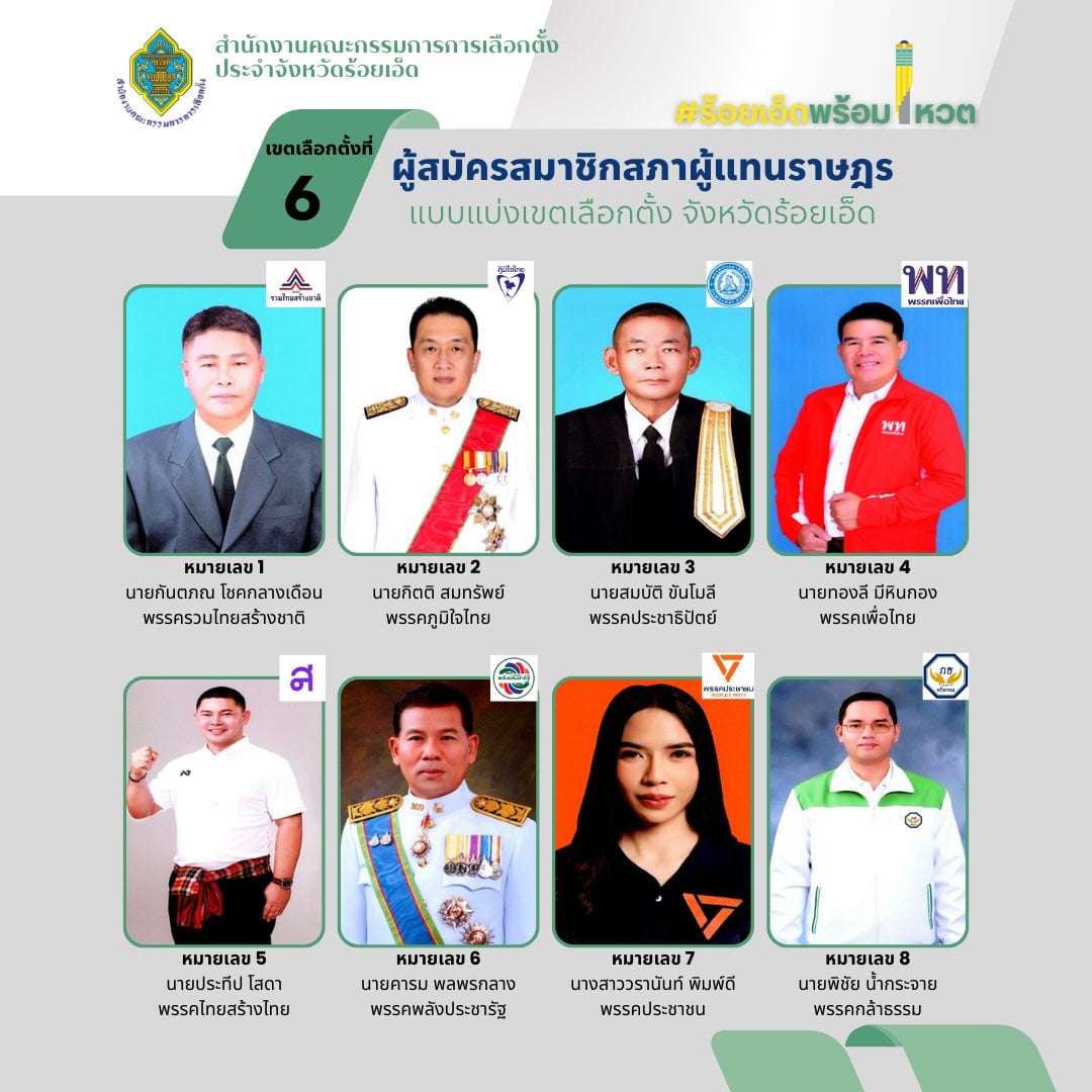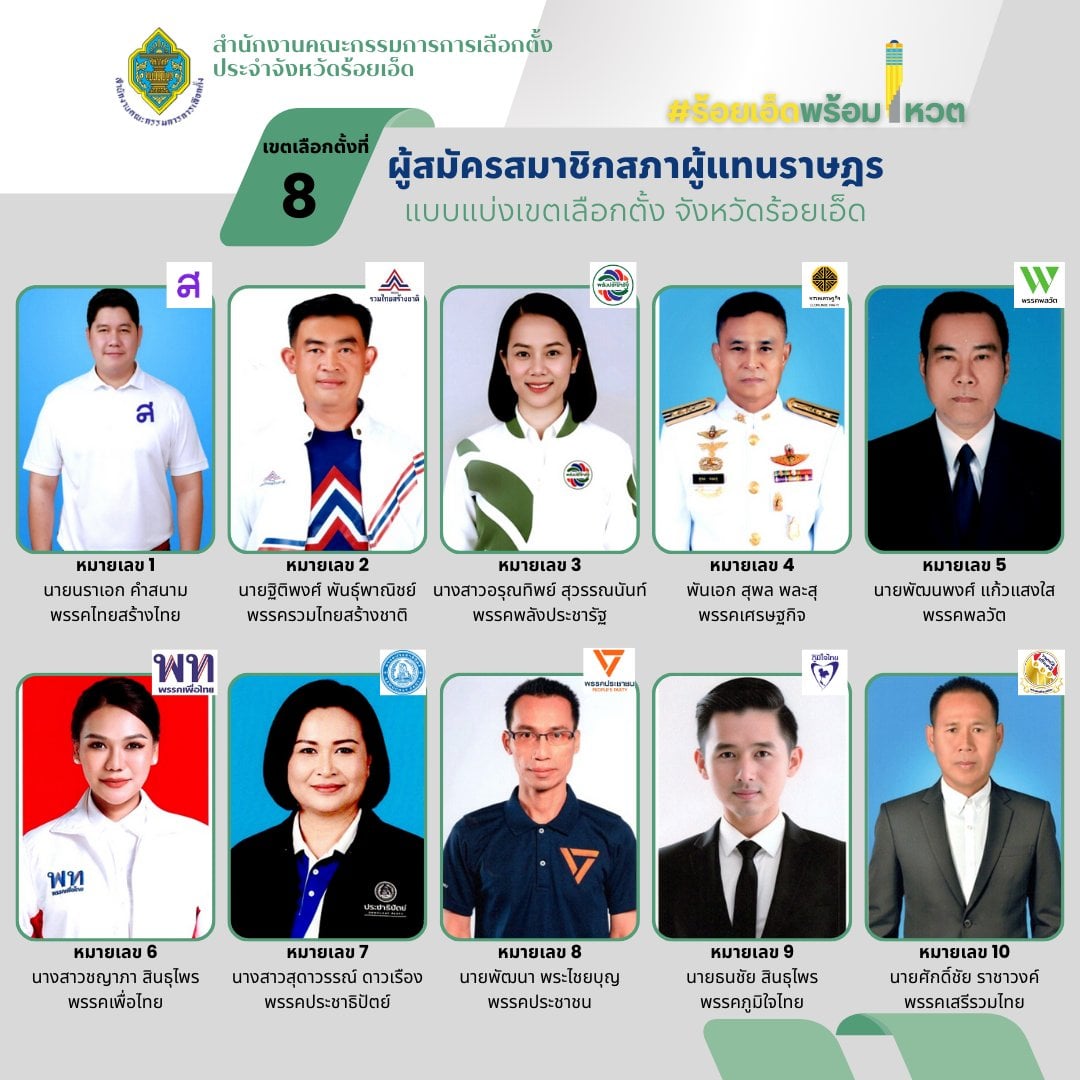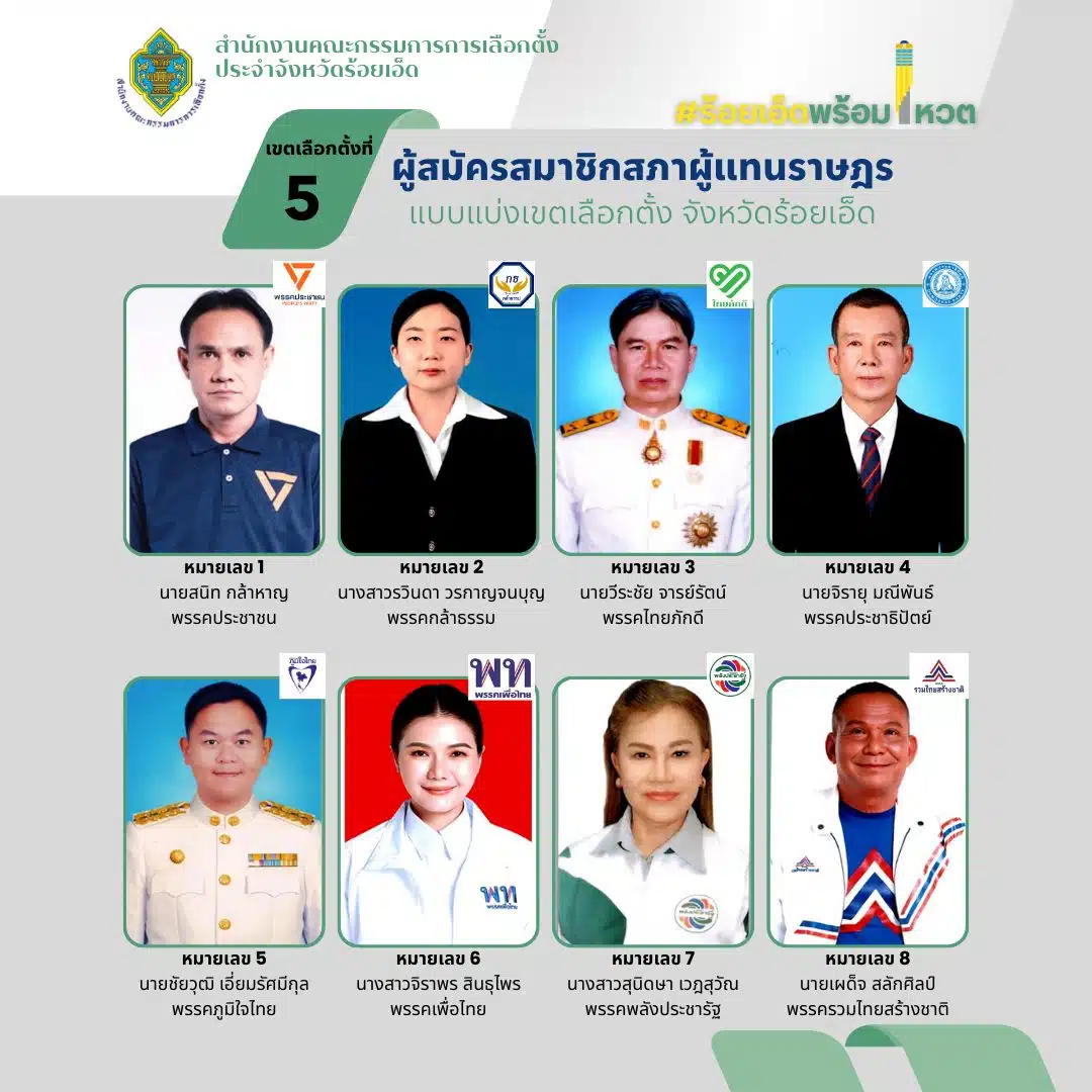 รายชื่อผู้สมัคร สส. ร้อยเอ็ด แบบแบ่งเขต ทั้ง 8 เขต เช็กเบอร์-พรรค เลือกตั้ง 2569