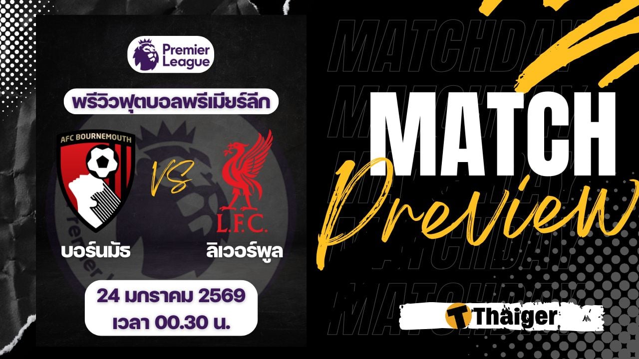 24 มกราคม 2569 เวลา 00.30 น. ถ่ายทอดสด ดูบอลสด ฟุตบอล พรีเมียร์ลีก ฤดูกาล 2025/26 ที่สนาม ไวทาลิตี้ สเตเดี้ยม บอร์นมัธ พบ ลิเวอร์พูล The Thaiger พาไปวิเคราะห์เกม พร้อมการทำนายผล และคาดการณ์ 11 ตัวจริงได้ที่นี่