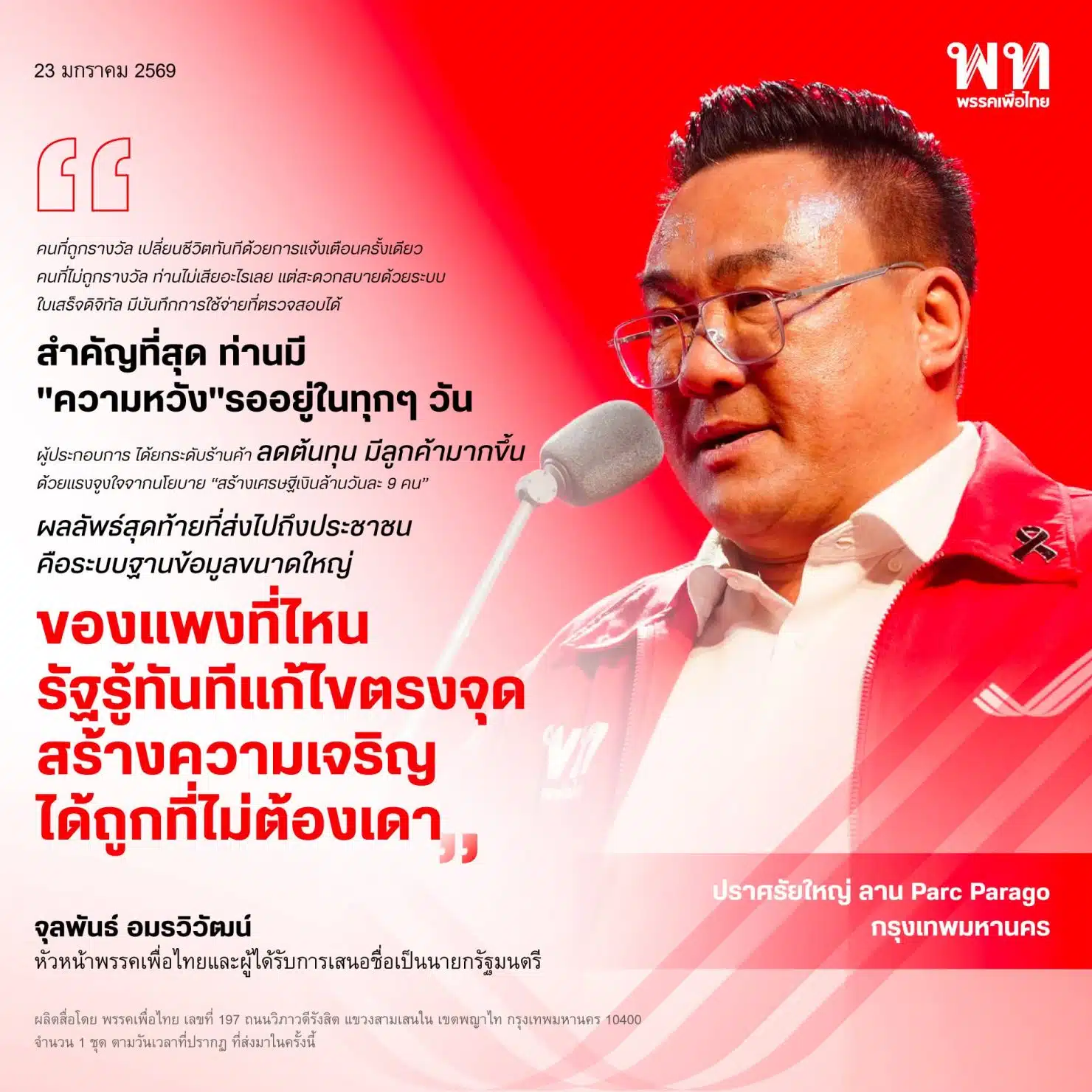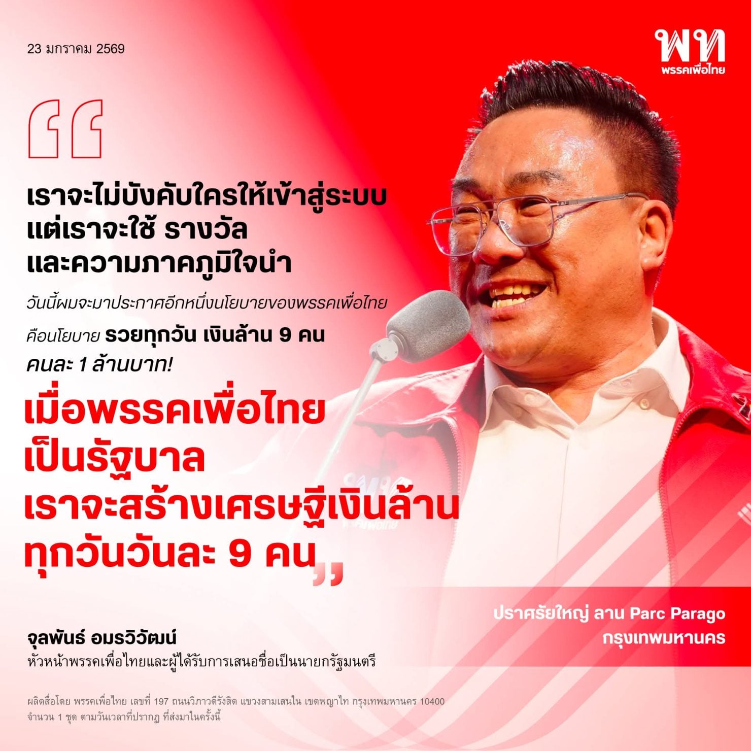 ผู้สื่อข่าวรายงานบรรยากาศเวทีปราศรัยใหญ่ของพรรคเพื่อไทย ณ ลานพาร์ค พารากอน เมื่อช่วงค่ำของวันที่ 23 มกราคม ที่ผ่านมา เป็นไปอย่างคึกคัก โดย นายจุลพันธ์ อมรวิวัฒน์ หัวหน้าพรรคและแคนดิเดตนายกรัฐมนตรีจากพรรคเพื่อไทย ได้ขึ้นเวทีประกาศวิสัยทัศน์และนโยบายโค้งสุดท้าย เรียกเสียงฮือฮาจากประชาชน เปิดตัวนโยบาย “รวยทุกวันเงินล้าน 9 คน” แจกรางวัลเพื่อดึงคนเข้าสู่ระบบฐานข้อมูล พร้อมทั้งเปิดเกมรุกทางการเมืองอัดคู่แข่งอย่างดุเดือด