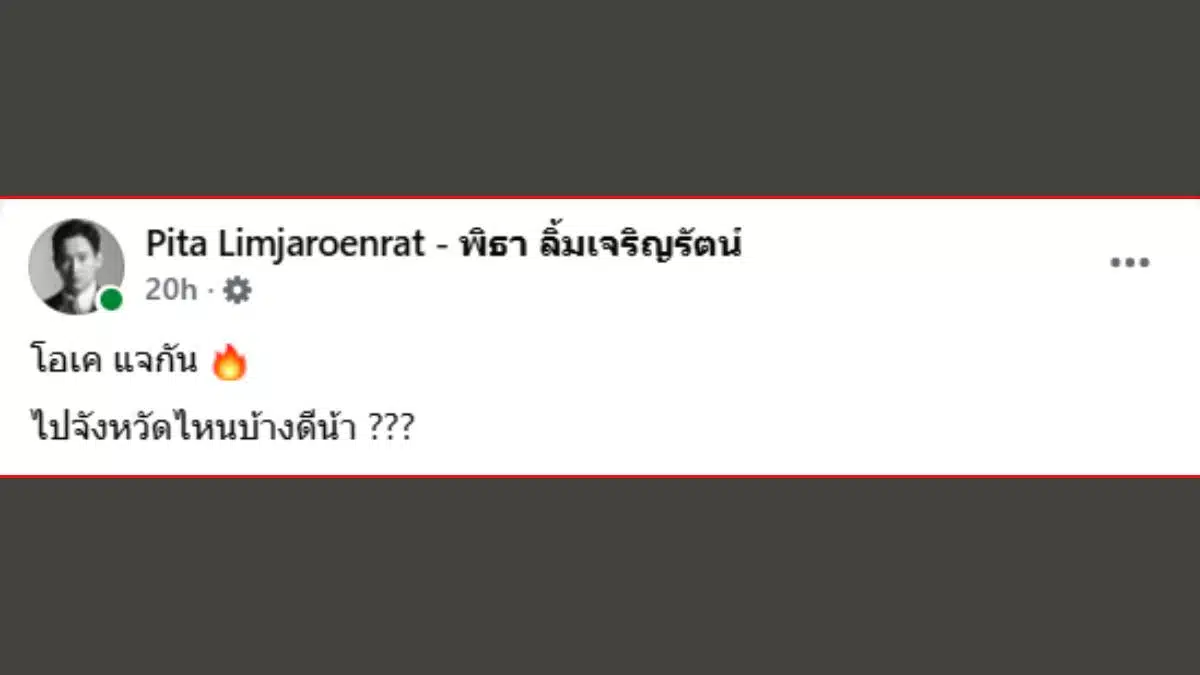 เป็นกระแสฮือฮาทันทีหลังจากที่ นายพิธา ลิ้มเจริญรัตน์ อดีตหัวหน้าพรรคก้าวไกล โพสต์ภาพวานนี้ (23 ม.ค.69) ขณะเดินทางกลับประเทศไทยผ่านเฟซบุ๊กส่วนตัว พร้อมข้อความสั้นๆ แต่ทรงพลังว่า “โอเค เจอกัน ไปจังหวัดไหนบ้างดีน้า???” ซึ่งเป็นการส่งสัญญาณชัดเจนว่า “ตัวตึง” ของพรรคส้มพร้อมกลับมาทำหน้าที่ “ผู้ช่วยหาเสียง” เพื่อกู้กระแสนิยมในช่วงโค้งสุดท้ายก่อนศึกเลือกตั้งวันที่ 8 กุมภาพันธ์ 2569 นี้