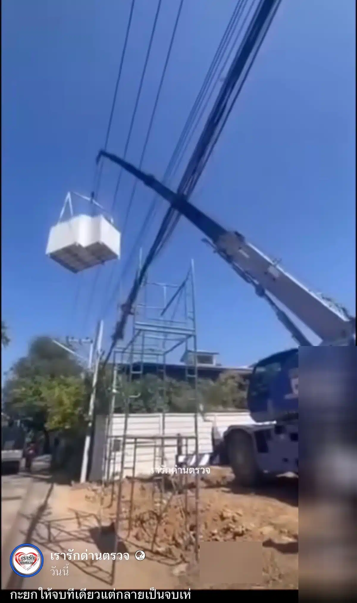 รถเครนได้ยกบ้านน็อกดาวน์น้ำหนักกว่า 1 ตัน ลงจากรถบรรทุก โดยได้ยกข้ามสายไฟฟ้าแรงสูงกว่า 10 เมตร เพื่อเตรียมมาวางไว้ในพื้นที่บ้านที่มีการปรับพื้นที่