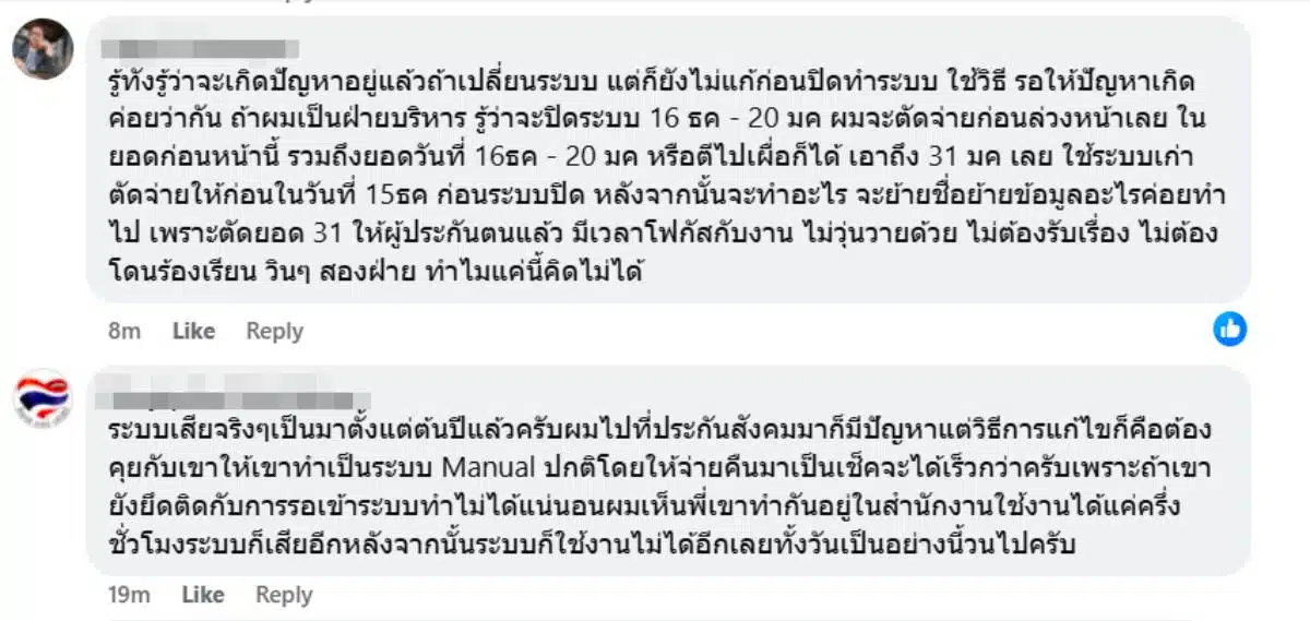 ความห็นจากผู้ใช้งานเฟซบุ๊กรายหนึ่งระบุว่า “ระบบเสียจริงๆเป็นมาตั้งแต่ต้นปีแล้วครับผมไปที่ประกันสังคมมาก็มีปัญหาแต่วิธีการแก้ไขก็คือต้องคุยกับเขาให้เขาทำเป็นระบบ Manual ปกติโดยให้จ่ายคืนมาเป็นเช็คจะได้เร็วกว่าครับเพราะถ้าเขายังยึดติดกับการรอเข้าระบบทำไม่ได้แน่นอนผมเห็นพี่เขาทำกันอยู่ในสำนักงานใช้งานได้แค่ครึ่งชั่วโมงระบบก็เสียอีกหลังจากนั้นระบบก็ใช้งานไม่ได้อีกเลยทั้งวันเป็นอย่างนี้วนไปครับ”