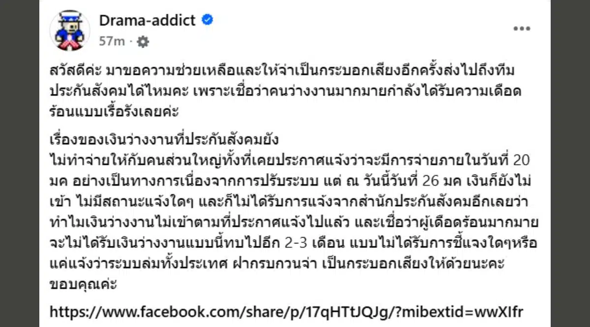 “ไม่ทำจ่ายให้กับคนส่วนใหญ่ทั้งที่เคยประกาศแจ้งว่าจะมีการจ่ายภายในวันที่ 20 มค อย่างเป็นทางการเนื่องจากการปรับระบบ แต่ ณ วันนี้วันที่ 26 มค เงินก็ยังไม่เข้า ไม่มีสถานะแจ้งใดๆ และก็ไม่ได้รับการแจ้งจากสำนักประกันสังคมอีกเลยว่าทำไมเงินว่างงานไม่เข้าตามที่ประกาศแจ้งไปแล้ว และเชื่อว่าผู้เดือดร้อนมากมายจะไม่ได้รับเงินว่างงานแบบนี้ทบไปอีก 2-3 เดือน แบบไม่ได้รับการชี้แจงใดๆหรือแค่แจ้งว่าระบบล่มทั้งประเทศ ฝากรบกวนจ่า เป็นกระบอกเสียงให้ด้วยนะคะ ขอบคุณค่ะ”