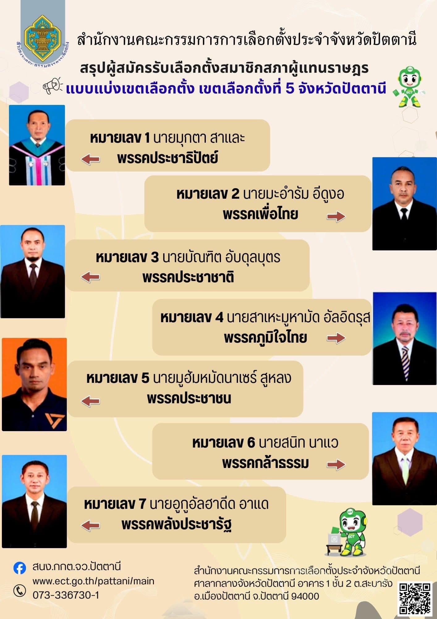 สำหรับ จ.ปัตตานี มีเขตเลือกตั้งทั้งหมด 5 เขต มีผู้สมัคร สส. แบบแบ่งเขตรวมทั้งหมด 33 คน ดังนี้
