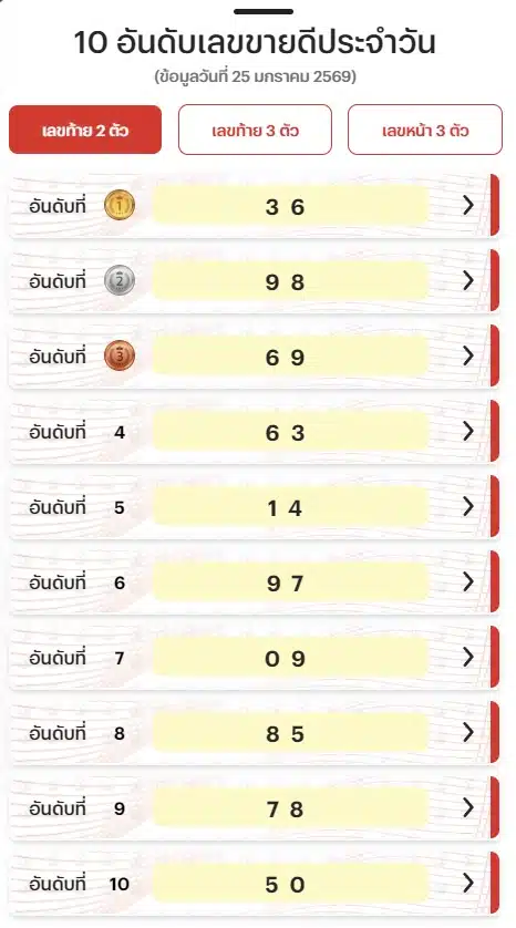 26 มกราคม 2569 — บรรยากาศก่อนวันออกสลากกินแบ่งรัฐบาลงวดประจำวันที่ 1 กุมภาพันธ์ 2569 เริ่มคึกคัก ล่าสุด “ลอตเตอรี่พลัส” ได้เปิดเผยข้อมูลจัดอันดับเลขท้าย 2 ตัว ยอดขายดีสุดประจำวันที่ 25 มกราคม พบว่ามีตัวเลขมงคล เลขกระแสสังคมตบเท้าเข้ามาติดอันดับเพียบ