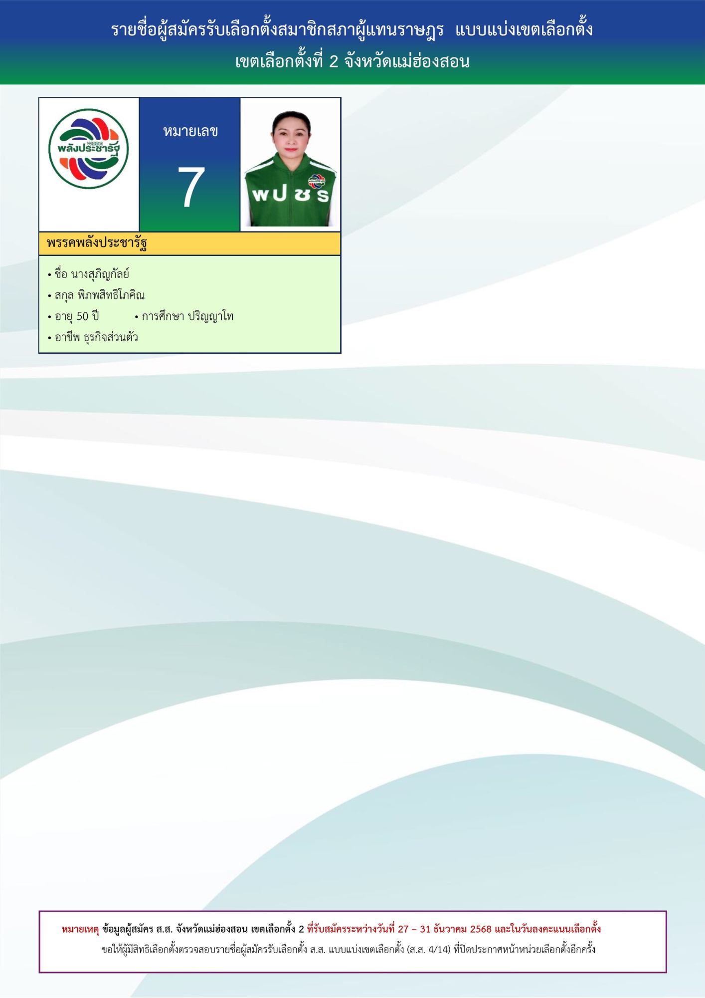 - หมายเลข 7 นางสุภิญกัลย์ พิภพสิทธิโภคิณ พรรคพลังประชารัฐ