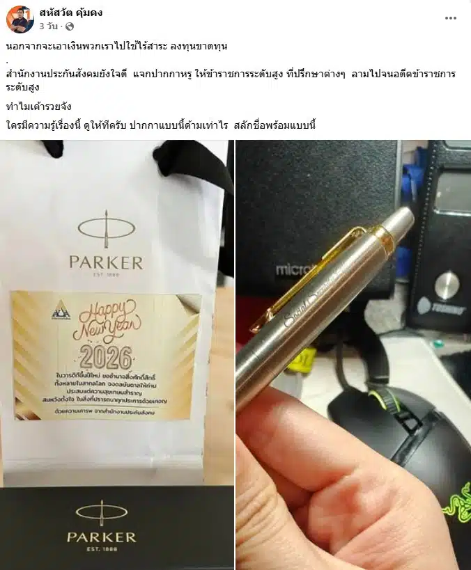 นอกจากประเด็นเรื่องชุดสูทแล้ว ก่อนหน้านี้ นายสหัสวัตยังได้โพสต์ภาพปากกาหรูที่สลักชื่อพร้อม โดยระบุว่า “นอกจากจะเอาเงินพวกเราไปใช้ไร้สาระ ลงทุนขาดทุน สำนักงานประกันสังคมยังใจดี แจกปากกาหรู ให้ข้าราชการระดับสูง ที่ปรึกษาต่างๆ ลามไปจนอดีตข้าราชการระดับสูง ทำไมเค้ารวยจัง ใครมีความรู้เรื่องนี้ ดูให้ทีครับ ปากกาแบบนี้ด้ามเท่าไร สลักชื่อพร้อมแบบนี้”