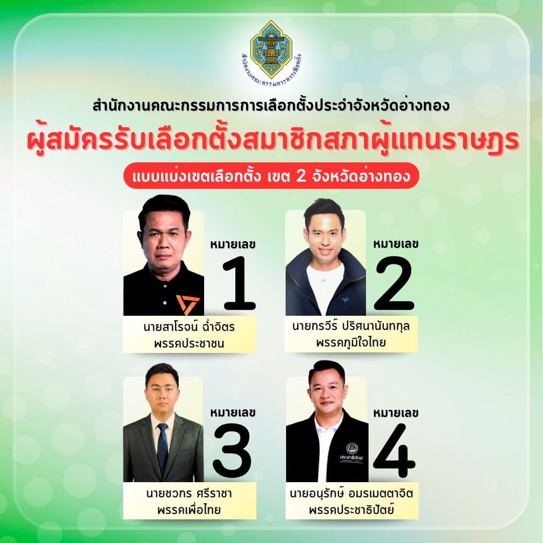 กกต. ประกาศรายชื่อ หมายเลขผู้สมัคร สส. อ่างทอง อย่างเป็นทางการ ทั้ง 2 เขตเลือกตั้ง เช็กรายชื่อและเบอร์ผู้สมัครได้ที่นี่