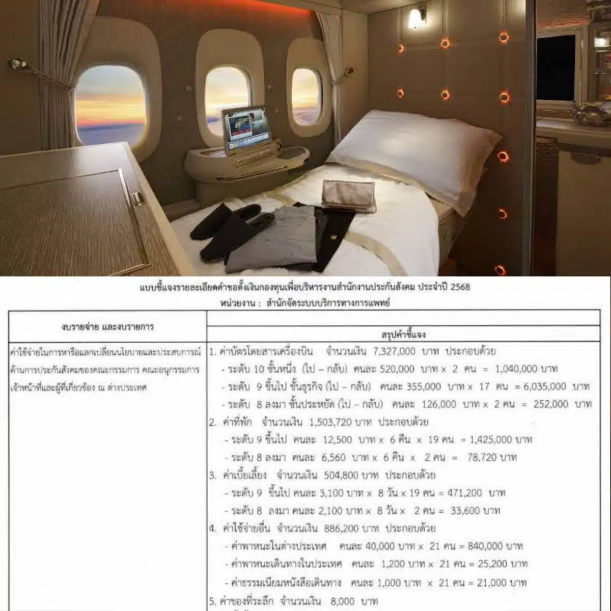 “ไปทริปหรูสุดว๊าวกับเงินผู้ประกันตน คณะดูงานจัดโดยสำนักจัดระบบทางการแพทย์ มอบทริปบินเฟิร์ทคลาสไป-กลับให้รุ่นใหญ่สองที่นั่งมูลค่าล้านกว่า”