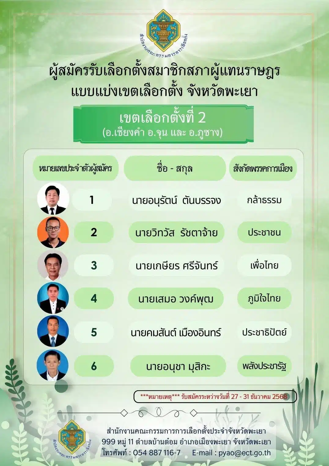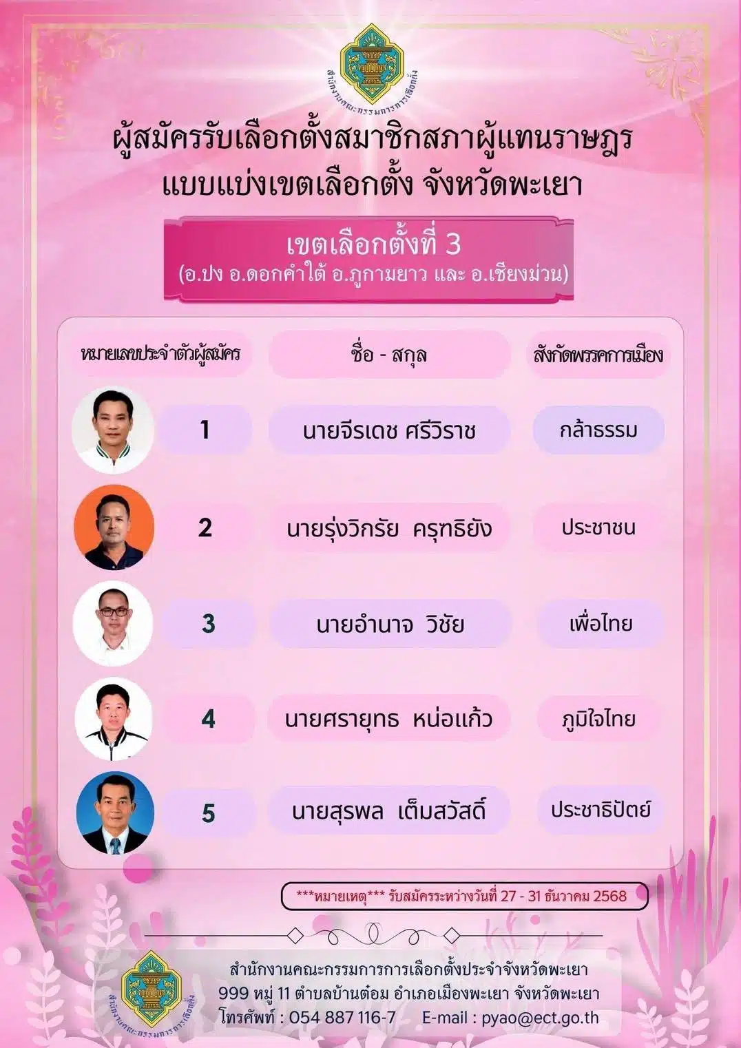 รายชื่อผู้สมัคร สส. พะเยา ทั้ง 3 เขต เช็กเบอร์-พรรค เลือกตั้ง 2569