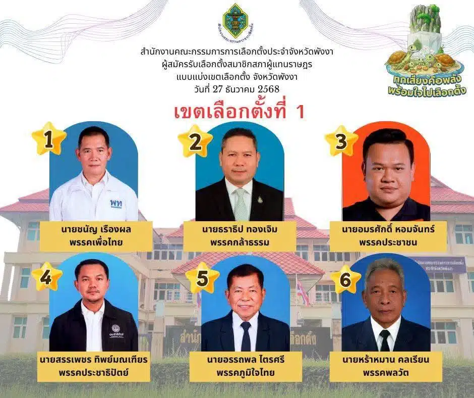 รายชื่อผู้สมัคร ส.ส. แบบแบ่งเขต จ.พังงา พร้อมเบอร์แต่ละพรรคทั้ง 2 เขต เลือกตั้ง 69 วันที่ 1 และ 8 ก.พ.นี้ เช็กสิทธิผู้มีสิทธิเลือกตั้งที่นี่