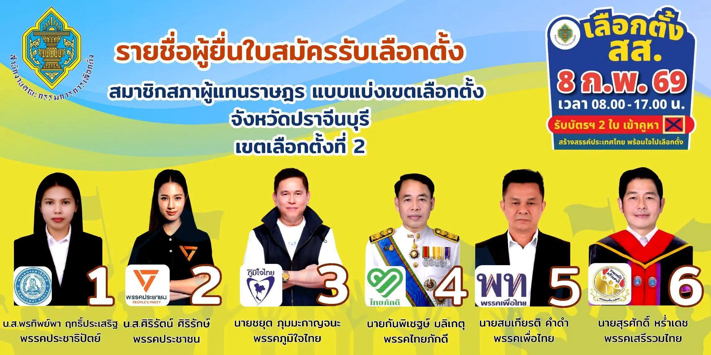 สำนักงานคณะกรรมการการเลือกตั้ง (กกต.) ได้ประกาศรายชื่อผู้สมัครรับเลือกตั้งสมาชิกสภาผู้แทนราษฎร (สส.) แบบแบ่งเขตเลือกตั้ง จ.ปราจีนบุรี อย่างเป็นทางการ ภายหลังปิดรับสมัครไปเมื่อวันที่ 27 – 31 ธันวาคม 2568 ที่ผ่านมา เพื่อให้ประชาชนได้ตรวจสอบรายชื่อและหมายเลขผู้สมัคร ก่อนจะถึงวันใช้สิทธิออกเสียงเลือกตั้งที่จะถึงนี้