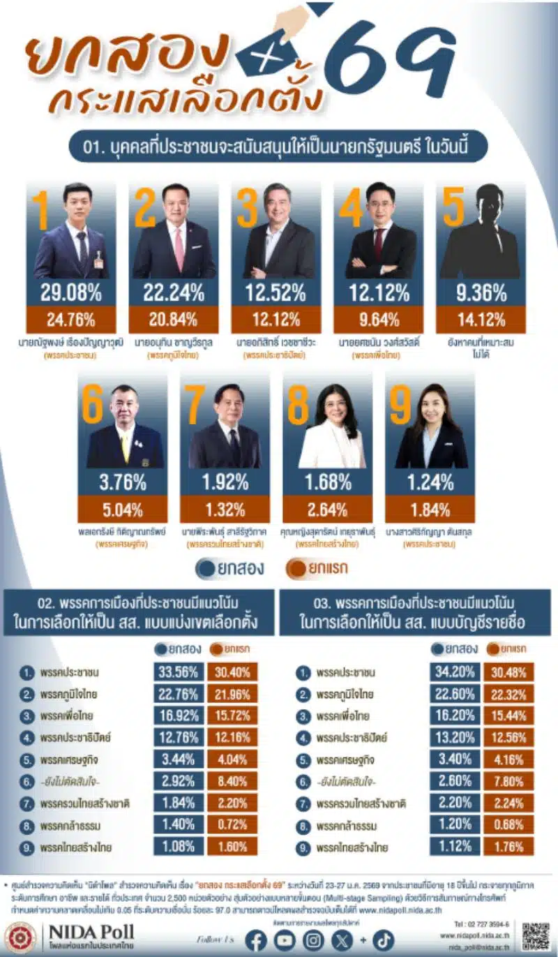 โพลของสถาบันบัณฑิตพัฒนบริหารศาสตร์ หรือ นิด้าโพล ได้เปิดเผยผลสำรวจเรื่อง “ยกสอง กระแสเลือกตั้ง 69” ทำการสำรวจระหว่างวันที่ 23-27 มกราคม 2569 จากประชาชนที่มีอายุ 18 ปีขึ้นไป กระจายทุกภูมิภาค ระดับการศึกษา อาชีพ และรายได้ ทั่วประเทศ รวมจำนวนทั้งสิ้น 2,500 หน่วยตัวอย่าง เกี่ยวกับกระแสการเลือกตั้ง ปี 2569
