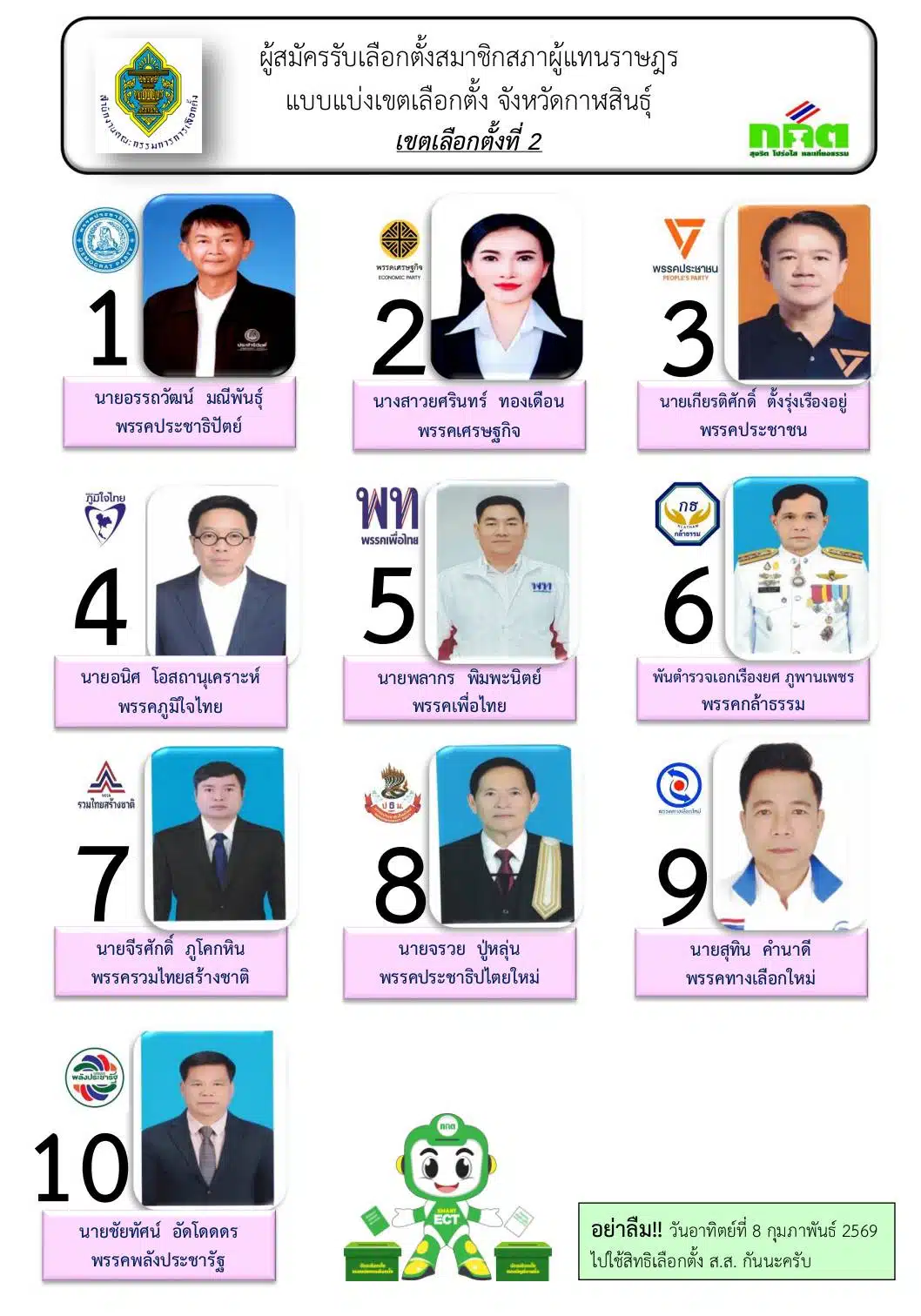 สำนักงานคณะกรรมการการเลือกตั้ง (กกต.) ได้ประกาศรายชื่อผู้สมัครรับเลือกตั้งสมาชิกสภาผู้แทนราษฎร (สส.) แบบแบ่งเขตเลือกตั้ง จ.กาฬสินธุ์ อย่างเป็นทางการ ภายหลังปิดรับสมัครไปเมื่อวันที่ 27 – 31 ธันวาคม 2568 ที่ผ่านมา เพื่อให้ประชาชนได้ตรวจสอบรายชื่อและหมายเลขผู้สมัคร ก่อนจะถึงวันใช้สิทธิออกเสียงเลือกตั้งที่จะถึงนี้