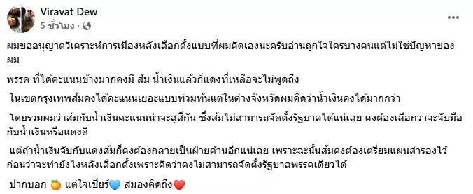 แต่ถ้าน้ำเงินจับกับแดงส้มก็คงต้องกลายเป็นฝ่ายค้านอีกแน่เลย เพราะฉะนั้นส้มคงต้องเตรียมแผนสำรองไว้ก่อนว่าจะทำยังไงหลังเลือกตั้งเพราะคิดว่าคงไม่สามารถจัดตั้งรัฐบาลพรรคเดียวได้ ปากบอก (ส้ม) แต่ใจเชียร์ (ฟ้า) สมองคิดถึง (แดง)”