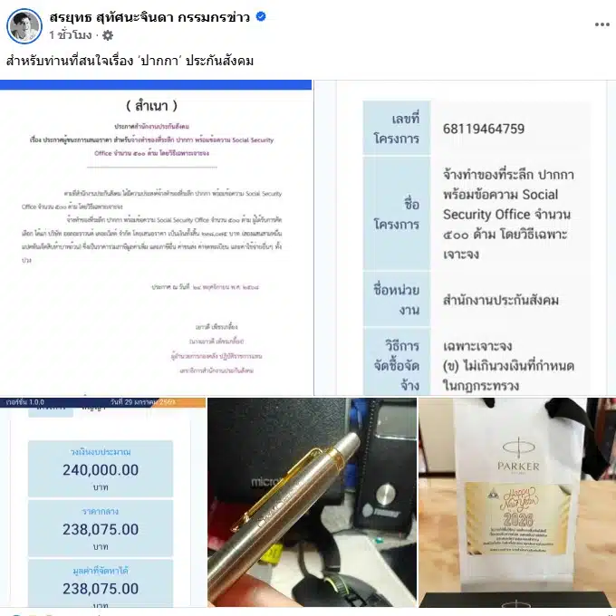 ล่าสุด นายสรยุทธ สุทัศนะจินดา ออกมาโพสต์ข้อความผ่านเฟซบุ๊ก สรยุทธ สุทัศนะจินดา กรรมกรข่าว นำเอกสารประกาศสำนักงานประกันสังคม เรื่อง ประกาศผู้ชนะการเสนอราคา มาเปิดเผยให้เห็นรายละเอียดกันชัด ๆ พบข้อมูลเกี่ยวกับการจัดซื้อจัดจ้างในปีงบประมาณ 2569 โดยจ้างทำของที่ระลึก ปากกา พร้อมข้อความ Social Security Office จำนวน 500 ด้าม งบประมาณตั้งไว้ 240,000 บาท โดยใช้วิธีเฉพาะเจาะจง ประเภท ข. ไม่เกินวงเงินที่กำหนดในกฎกระทรวง