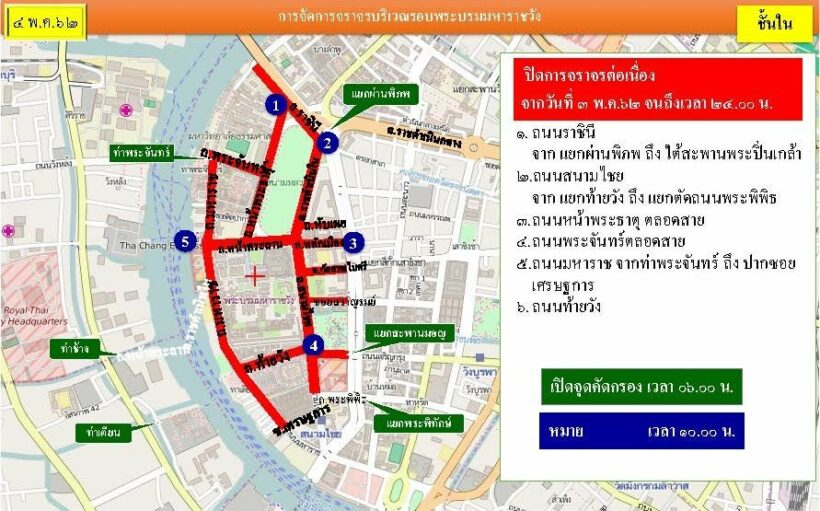 วันที่ 4 พ.ค. 2562 จะปิดการจราจรต่อเนื่องจากวันที่ 3 พ.ค. 2562 จนถึงเวลา 24.00 น. และเปิดจุดคัดกรอง 06.00 น