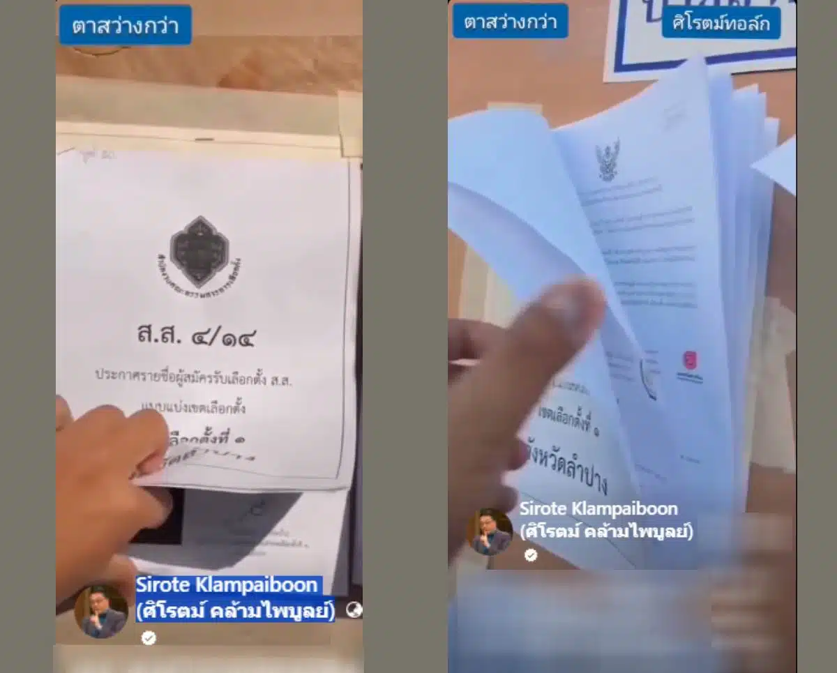เนื้อหาจากบัญชีเฟซบุ๊ก Sirote Klampaiboon (ศิโรตม์ คล้ามไพบูลย์) เมื่อช่วงสายที่ผ่านมาระบุว่า “ด่วน! พรรคประชาชนโดนแล้วที่ชลบุรี เลือกตั้งล่วงหน้าในพื้นที่ชลบุรีเขต 1 บนบอร์ดไม่มีรายชื่อผู้สมัครและเบอร์พรรคปชน. จ.ลำปาง เขต 1 เบอร์ 8 แต่เมื่อชาวบ้านจับได้ เจ้าหน้าที่หน่วยเลือกตั้งกลับโกหกว่า ผู้สมัครพรรคประชาชนจ.ลำปาง เขต 1 เบอร์ 8 ถูกตัดสิทธิ ทั้งที่ผู้สมัครไม่ได้ถูกตัดสิทธิ”