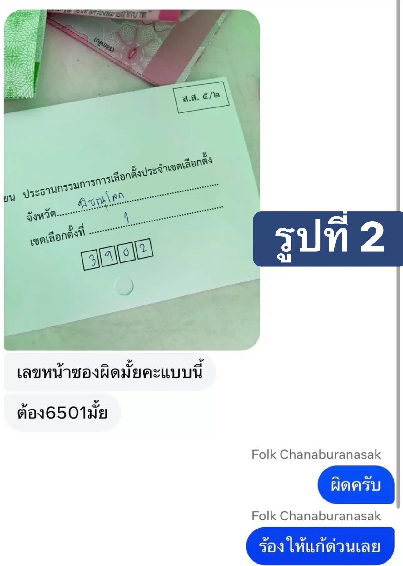 รูปที่ 2: ผมไม่แน่ใจว่าเป็นใคร ผมได้รับรูปนี้จาก โฟล์ค ณฐชนน ชนะบูรณาศักดิ์ – Natachanon Chanaburanasak ซึ่งเป็นผู้สมัคร สส.เขต 1 จ.พิษณุโลก บอกว่าเป็นประชาชนในเขตที่เลือกตั้งล่วงหน้านอกเขต (ใน จ.ปทุมธานี) ส่งมาให้ และมันผิดทั้งรหัสจังหวัดและรหัสเขต