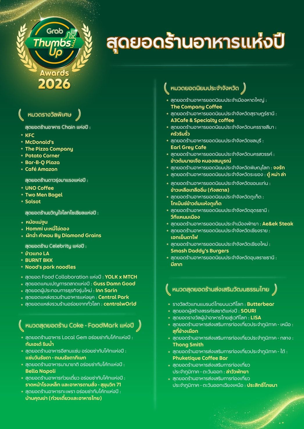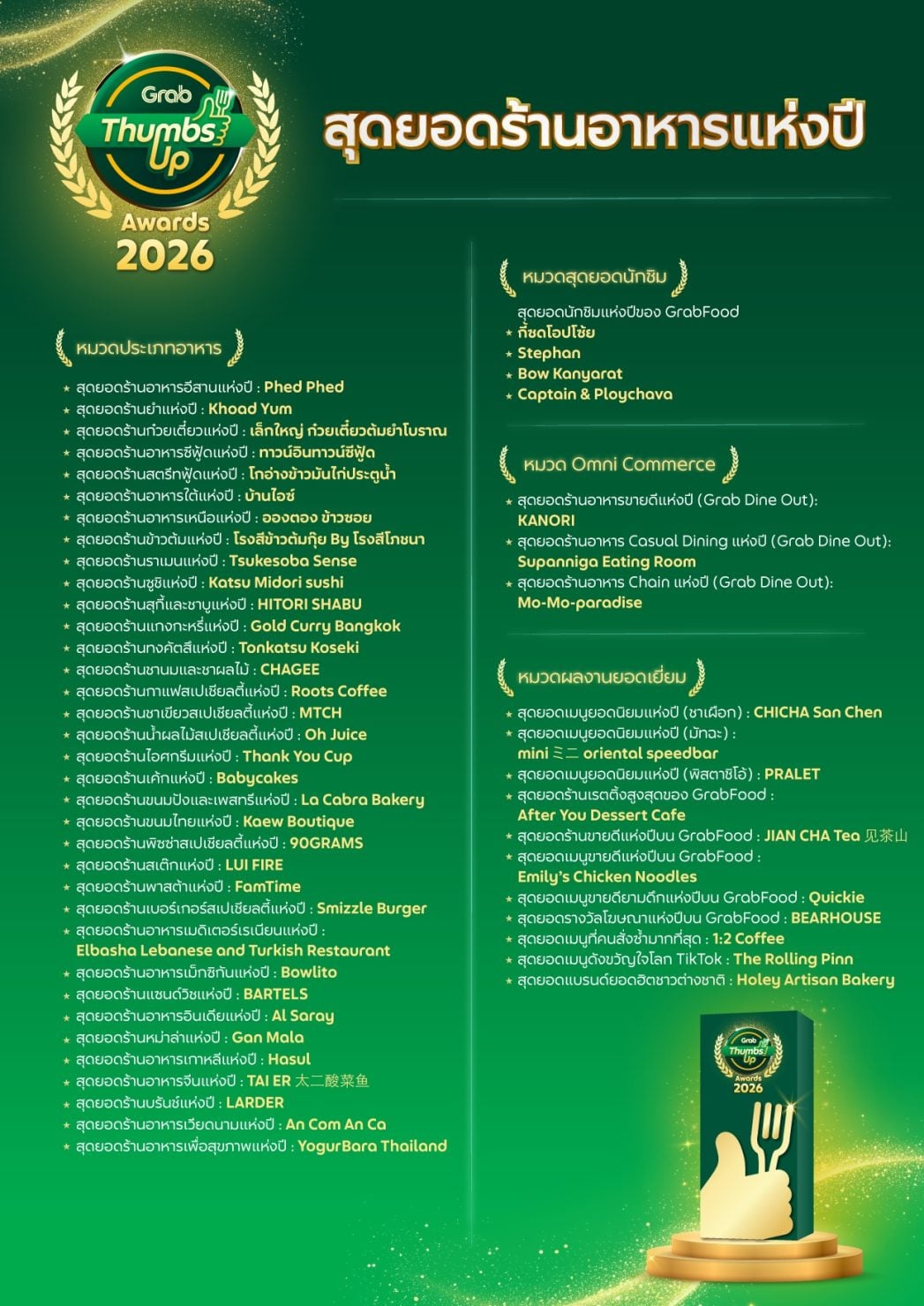 แกร็บฟู้ด แอปสั่งอาหารอันดับ 1 ในประเทศไทย เผยรายชื่อ 100 ร้านอาหารที่คว้ารางวัล “สุดยอดร้านอาหารแห่งปี” ในงาน GrabThumbsUp Awards 2026 ซึ่งปีนี้จัดขึ้นภายใต้คอนเซ็ปต์ “The Taste of Trust” ตอกย้ำมาตรฐานคุณภาพความอร่อยที่ได้รับความไว้วางใจจากผู้บริโภคทั่วประเทศอย่างแท้จริง โดยไฮไลต์สำคัญในปีนี้ คือ การมอบรางวัลอันทรงเกียรติจาก การท่องเที่ยวแห่งประเทศไทย (ททท.) เพื่อยกย่องร้านอาหารและผู้ที่มีบทบาทสำคัญในการส่งเสริมอุตสาหกรรมท่องเที่ยวไทยผ่านอัตลักษณ์ด้านอาหาร นำโดยรางวัล “สุดยอดผู้นำอาหารไทยสู่เวทีโลก” ที่มอบให้กับ ลิซ่า–ลลิษา มโนบาล Amazing Thailand Ambassador และรางวัล “สุดยอดผู้สร้างสรรค์รสชาติแห่งปี” ซึ่งตกเป็นของแบรนด์ SOURI จากโพรเจกต์ SOURI Local Exclusive Menu ชูเอกลักษณ์ท้องถิ่นไทยผ่านมาการอง 12 รสชาติประจำจังหวัด พร้อมด้วย 5 สุดยอดร้านอาหารส่งเสริมการท่องเที่ยวในแต่ละภาค อันได้แก่ สุกี้ช้างเผือก, ภูเก็ตทีค คอฟฟี่บาร์, ล่าวัวพัทยา, ประสิทธิ์โภชนา และ ทองสมิทธ์ พร้อมกันนี้ แกร็บยังได้ประกาศปรับดีไซน์ตราสัญลักษณ์ของซับแบรนด์ GrabThumbsUp เพื่อยกระดับมาตรฐานและคุณภาพที่เป็นหนึ่งเดียว มุ่งสร้างการจดจำและเชื่อมต่อความไว้วางใจให้กับผู้บริโภคทั่วทั้งภูมิภาคเอเชียตะวันออกเฉียงใต้