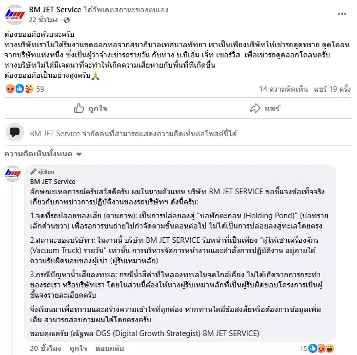 บริษัท บีเอ็ม เจ็ท เซอร์วิส (BM JET SERVICE) ในฐานะผู้ให้บริการเช่ารถดูดโคลนและเครื่องจักรสำหรับงานอุตสาหกรรม ขอเรียนชี้แจงข้อเท็จจริงเกี่ยวกับภาพข่าวการปฏิบัติงานในพื้นที่พัทยา และขอประกาศจุดยืนในการดำเนินธุรกิจ ดังนี้