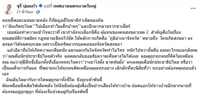 ก่อนหน้านี้ นายจูรี โพสต์ระบายความรู้สึกในเฟซบุ๊กส่วนตัวว่า “ตอนนี้พอคะแนนตามหลัง ก็เริ่มบูลลี่ในชาติกำเนิดของฉันว่า “ฉันเกิดระโนด” “ไปเลือกทำไมเด็กบ้านๆ” “และอีกมากมายจากขาเชียร์