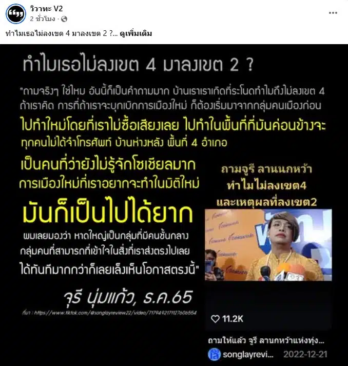 อย่างไรก็ตาม เพจดังอย่าง วิวาทะ V2 ได้นำถ้อยคำสัมภาษณ์กับสื่อเมื่อเดือน ธ.ค. 2565 ที่ผ่านมาถึงสาเหตุที่ไม่ลงสมัคร สส. ในเขต 4 อำเภอระโนด บ้านเกิด แต่เลือกมาลงเขต 2 หาดใหญ่แทน โดยระบุว่า