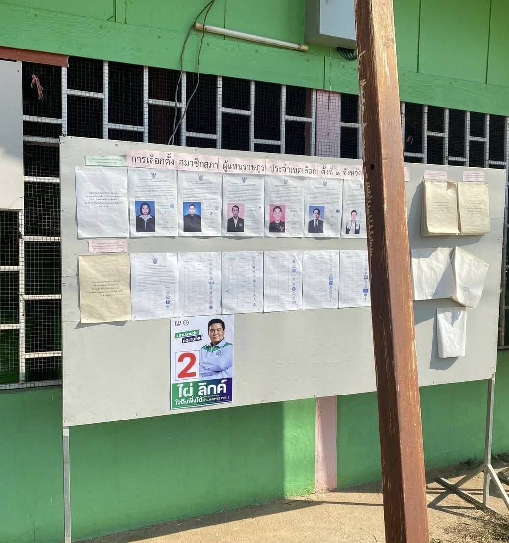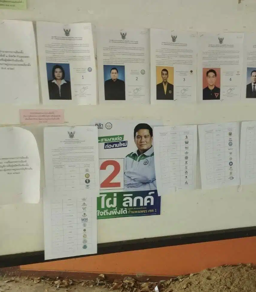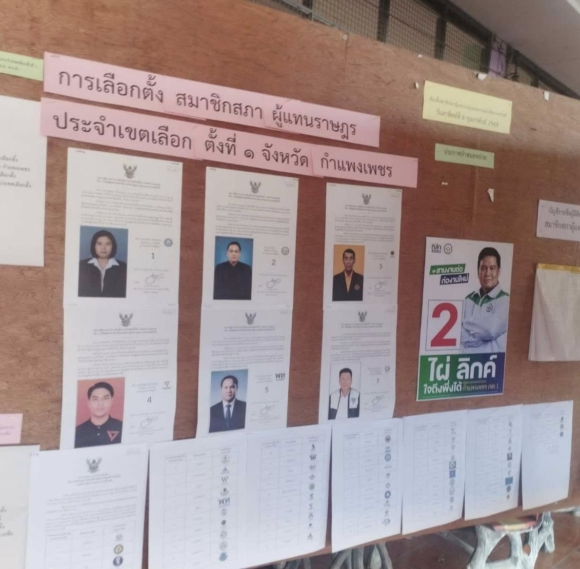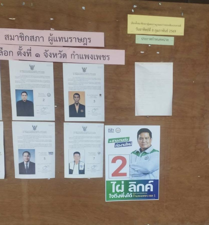 นายปริญวัฒน์ ทวีกิจศิรพงษ์ ผู้สมัคร สส.กำแพงเพชร พรรคประชาชน โพสต์ภาพกระดานหน้าหน่วยเลือกตั้งที่มีการติดหน้าผู้สมัครของแต่ละพรรคการเมือง โดยพบว่ามีการติดแผ่นป้ายหาเสียงของ นายไผ่ ลิกค์ ผู้สมัคร สส.กำแพงเพชร พรรคกล้าธรรม โดยระบุว่า