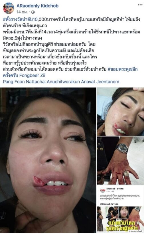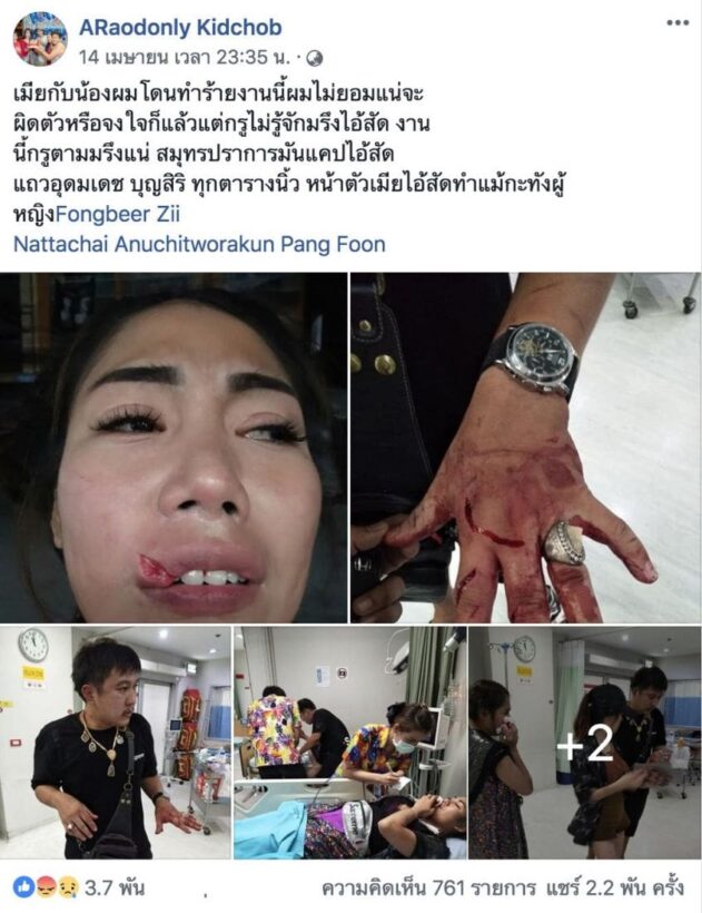 ผู้ใช้เฟสบุ๊คชื่อ ARaodonly Kidchob ได้โพสต์ภาพชายหญิงมีลักษณะบาดแผลถูกทำร้ายมา เมื่อคืนวันที่ 14 เมษายน ที่ผ่านมา พร้อมกับระบุข้อความว่า