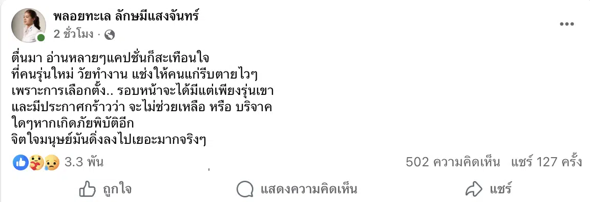 “ตื่นมา อ่านหลายๆ แคปชั่นก็สะเทือนใจ ที่คนรุ่นใหม่ วัยทำงาน แช่งให้คนแก่รีบตายไวๆ เพราะการเลือกตั้ง.. รอบหน้าจะได้มีแต่เพียงรุ่นเขา”