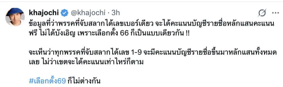 ขจร เจียรนัยพานิชย์ หรือ @khajochi บล็อกเกอร์ชื่อดัง ได้ออกมาโพสต์ข้อความผ่านแพลตฟอร์ม X (Twitter) ตั้งข้อสังเกตถึงความผิดปกติของผลคะแนนเลือกตั้ง 69 นส่วนของคะแนนบัญชีรายชื่อ (ปาร์ตี้ลิสต์) ที่พุ่งสูงขึ้นอย่างน่าสงสัยในกลุ่มพรรคการเมืองที่จับสลากได้หมายเลข เลขตัวเดียว เช่น เบอร์ 1-5 ทั้งที่ไม่ใช่พรรคใหญ่ มีคนเลือกแบบเขตน้อยมาก