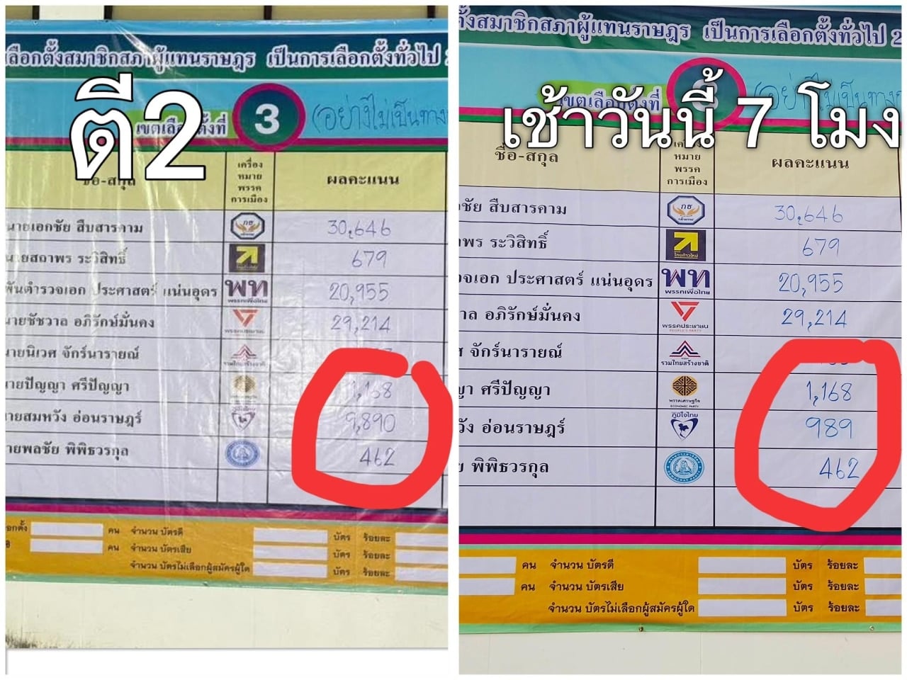 นาย ชัชวาล อภิรักษ์มั่นคง ผู้สมัคร สส.ขอนแก่น เขต 3 พรรคประชาชน โพสต์รูปภาพผลคะแนนในเขตเลือกตั้งที่ 3 โดยเป็นภาพผลการเลือกตั้งเทียบระหว่างตี 2 กับ เช้าวันนี้ 7 โมง โดนตอนตี 2 มีผู้สมัครได้คะแนนเสียง 9,890 ก่อนที่ตอนเช้าจะแก้กลับมาเป็น 989