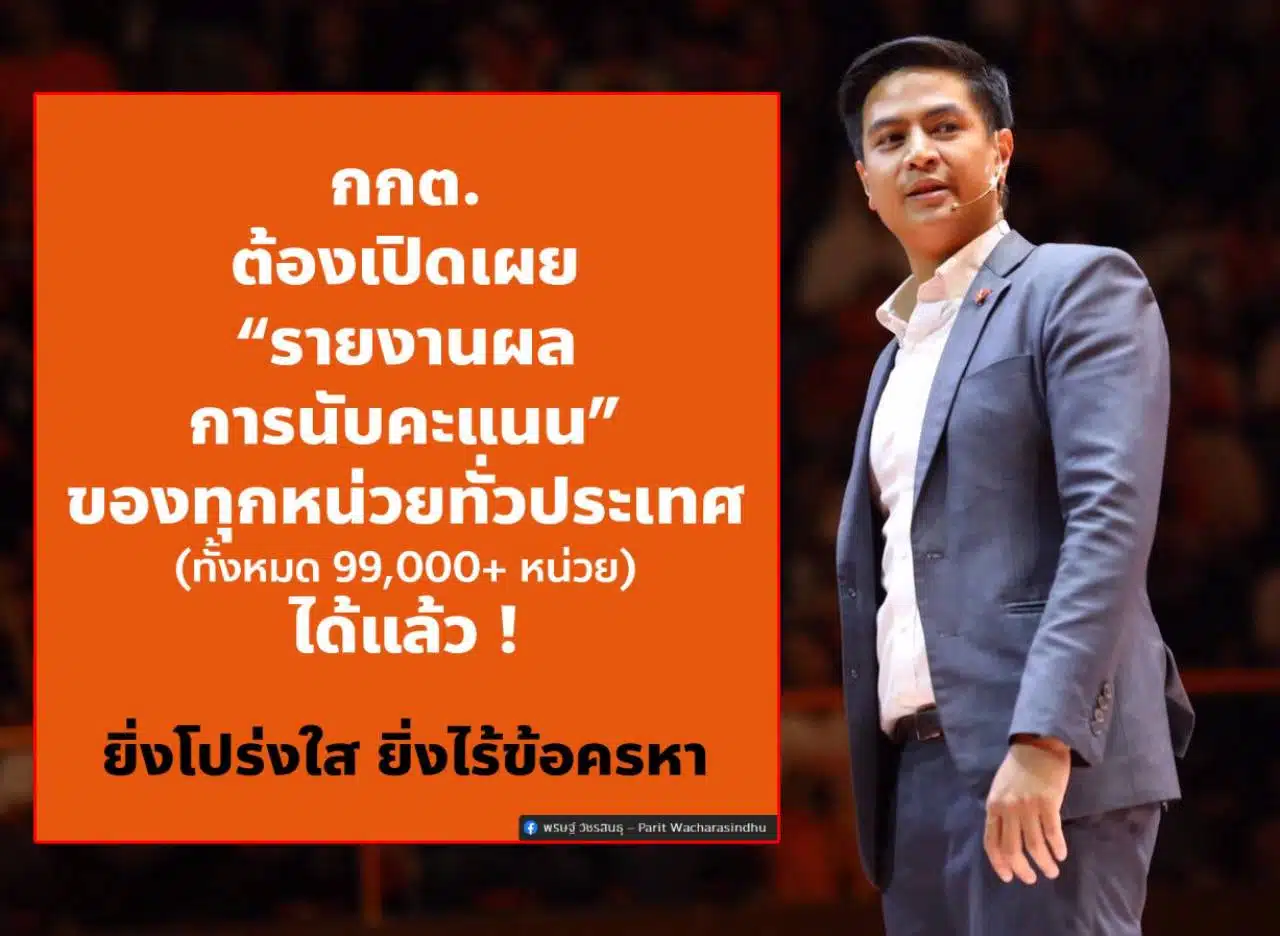 นาย พริษฐ์ วัชรสินธุ หรือ ไอติม ว่าที่ สส.บัญชีรายชื่อพรรคประชาชน ได้โพสต์ข้อความเฟซบุ๊กถึง กกต. ว่า “[ ยิ่งโปร่งใส ยิ่งไร้ข้อครหา: กกต. ต้องเปิดเผย “รายงานผลการนับคะแนน” ของทุกหน่วยทั่วประเทศ ได้แล้ว หลังเข้าสู่วันที่ 2 หลังปิดหีบเลือกตั้ง ]