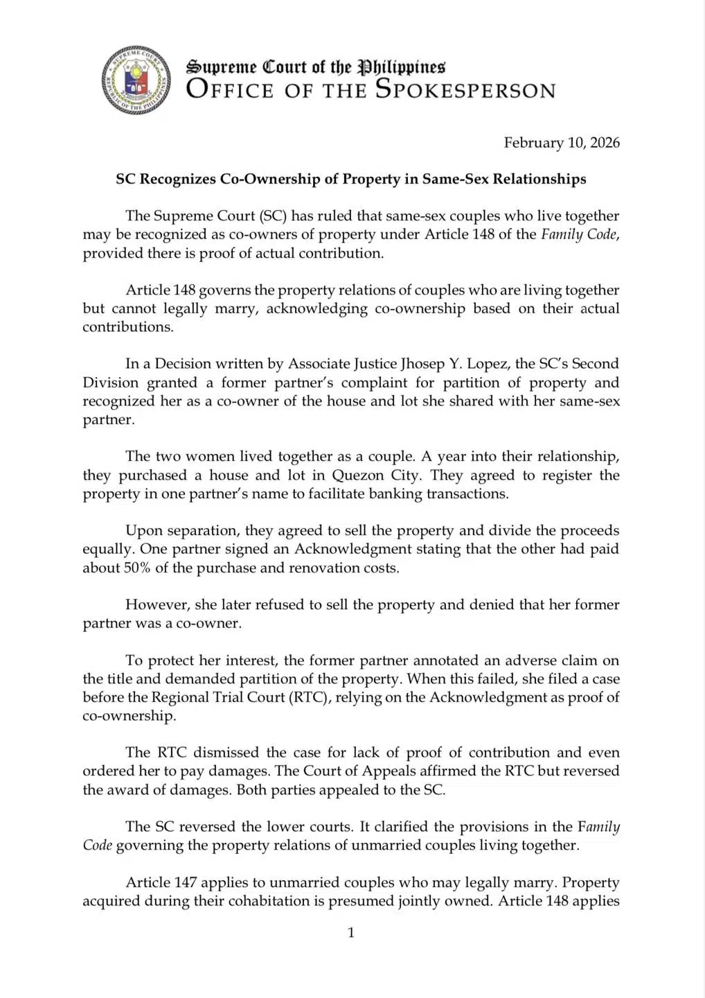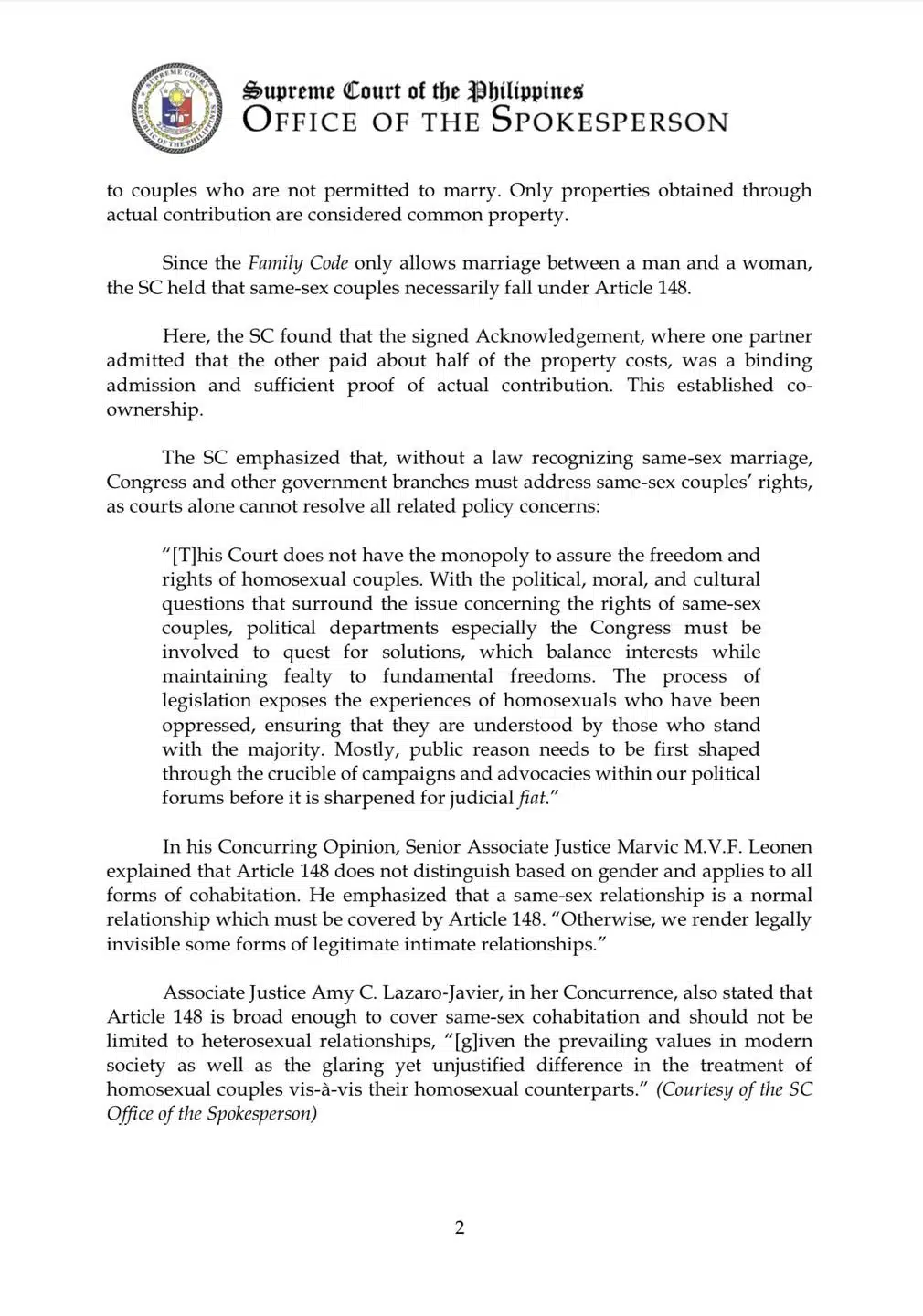 ศาลสูงสุดแห่งฟิลิปปินส์ (SC) สร้างบรรทัดฐานใหม่ทางสังคมและกฎหมาย มีคำพิพากษารับรองให้ “คู่รักเพศเดียวกันที่ใช้ชีวิตร่วมกัน” สามารถได้รับการยอมรับในฐานะ “เจ้าของร่วม”ในทรัพย์สินที่ได้มาด้วยกัน ตามมาตรา 148 ของประมวลกฎหมายครอบครัวหากมีหลักฐานการร่วมสร้างหรือร่วมจ่ายจริง